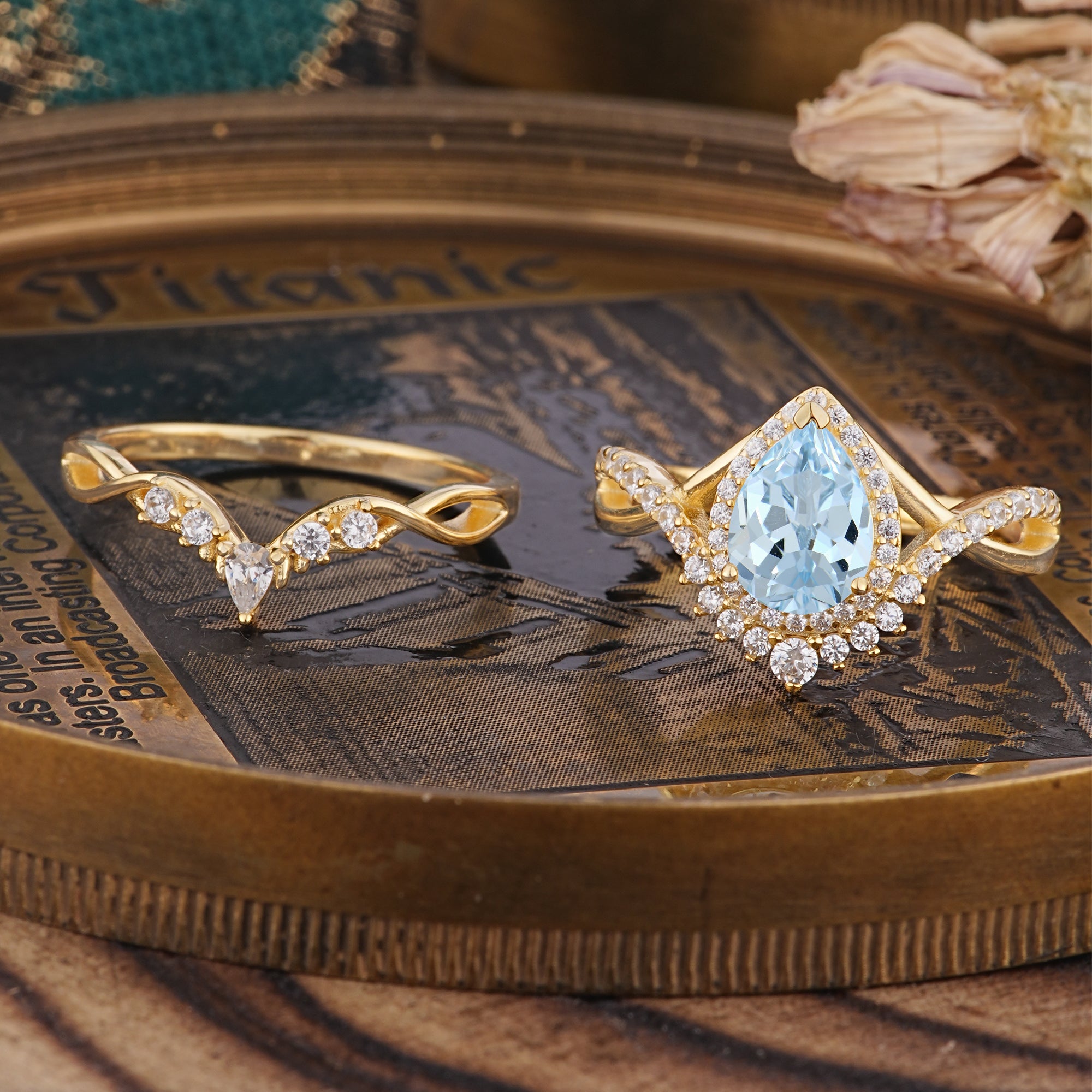 Elegant Pear-Cut Aquamarine Engagement Ring Set