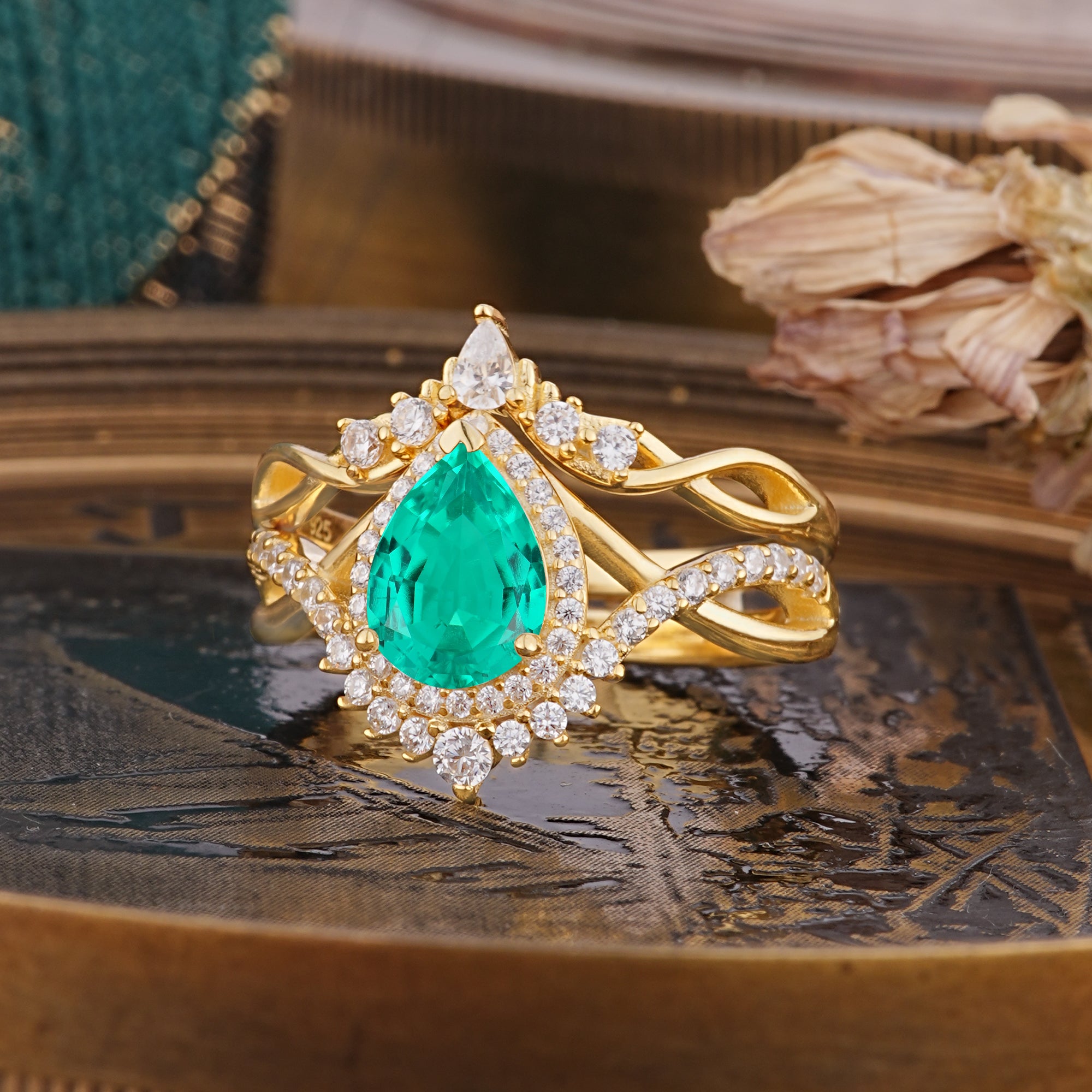 Elegant Pear-Cut Emerald Engagement Ring Set