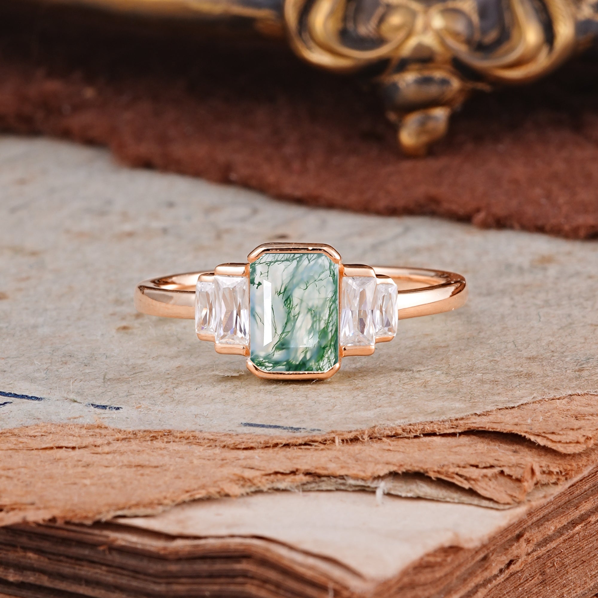 Emerald Cut Baguette Side Stones Moss Agate Engagement Ring