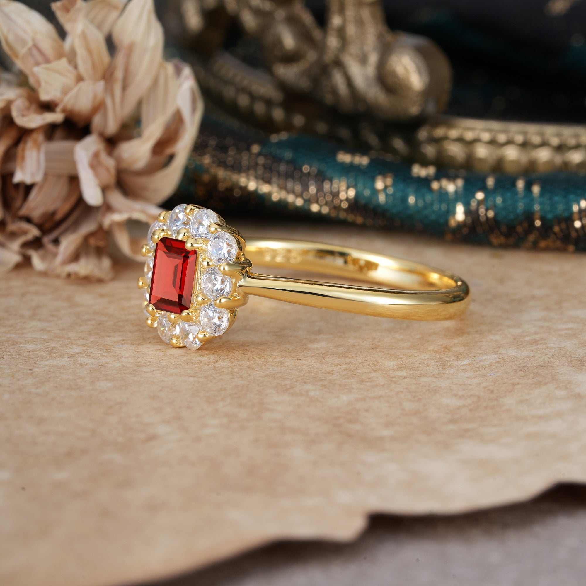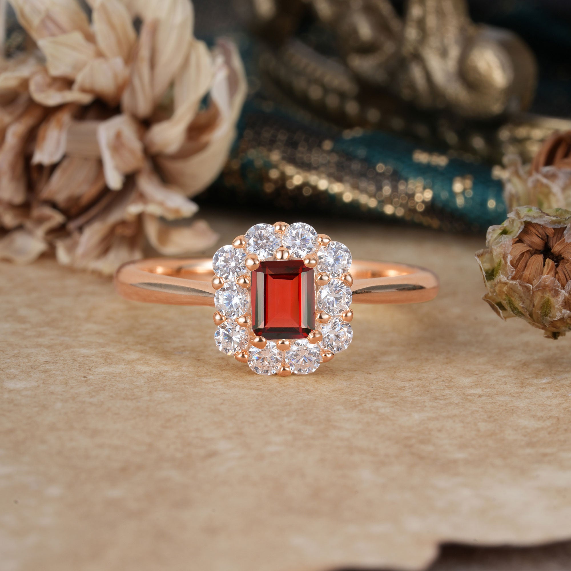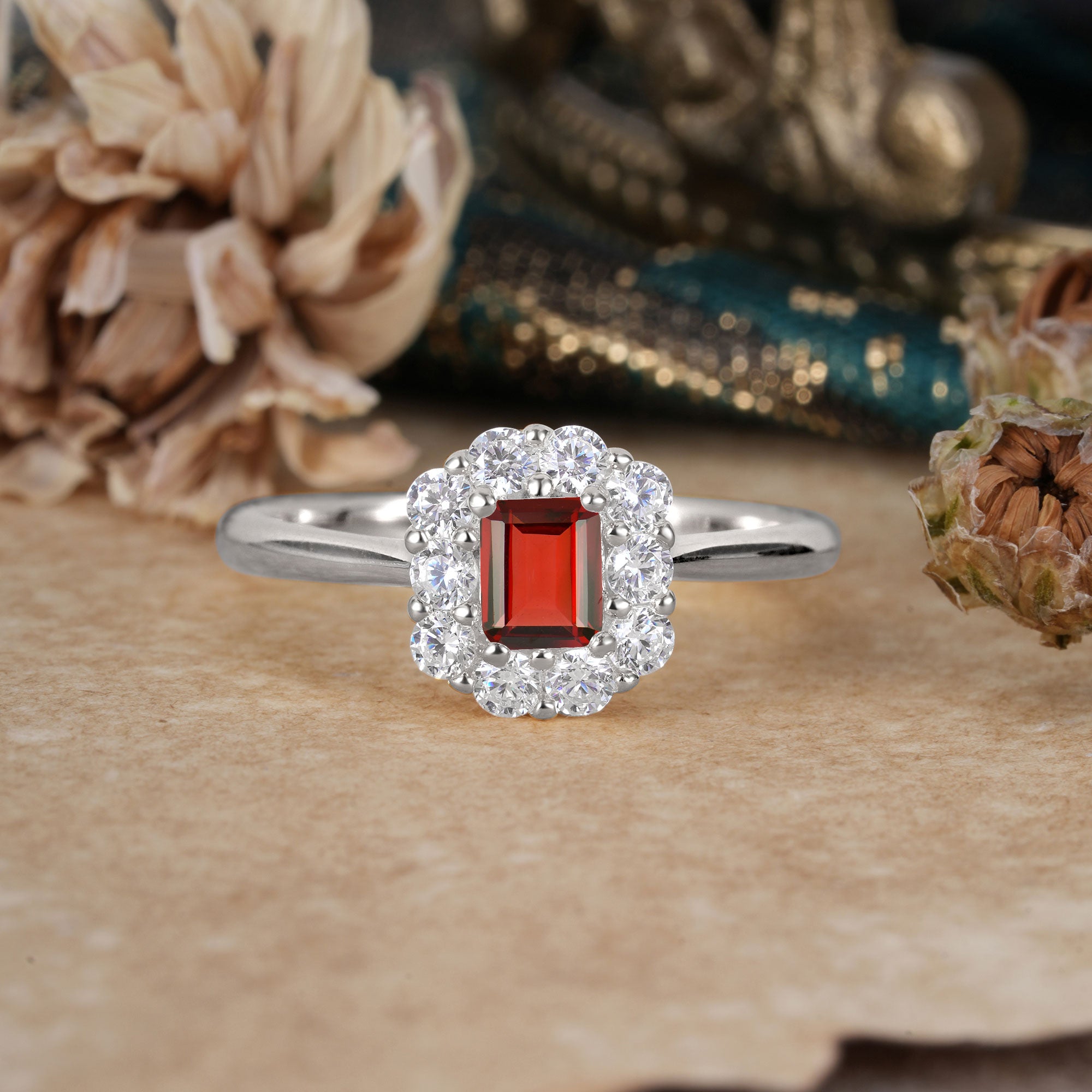 The Natural Garnet Emerald Cut Halo Promise Ring for Her radiates timeless elegance with a deep red garnet, precision-cut in a sleek emerald shape. Encircled by a sparkling halo of accent diamonds, this eco-friendly promise ring symbolizes love and commitment. Crafted by Romalar Jewelry, its rich hue and delicate design make it a stunning choice for heartfelt proposals or cherished gifts.