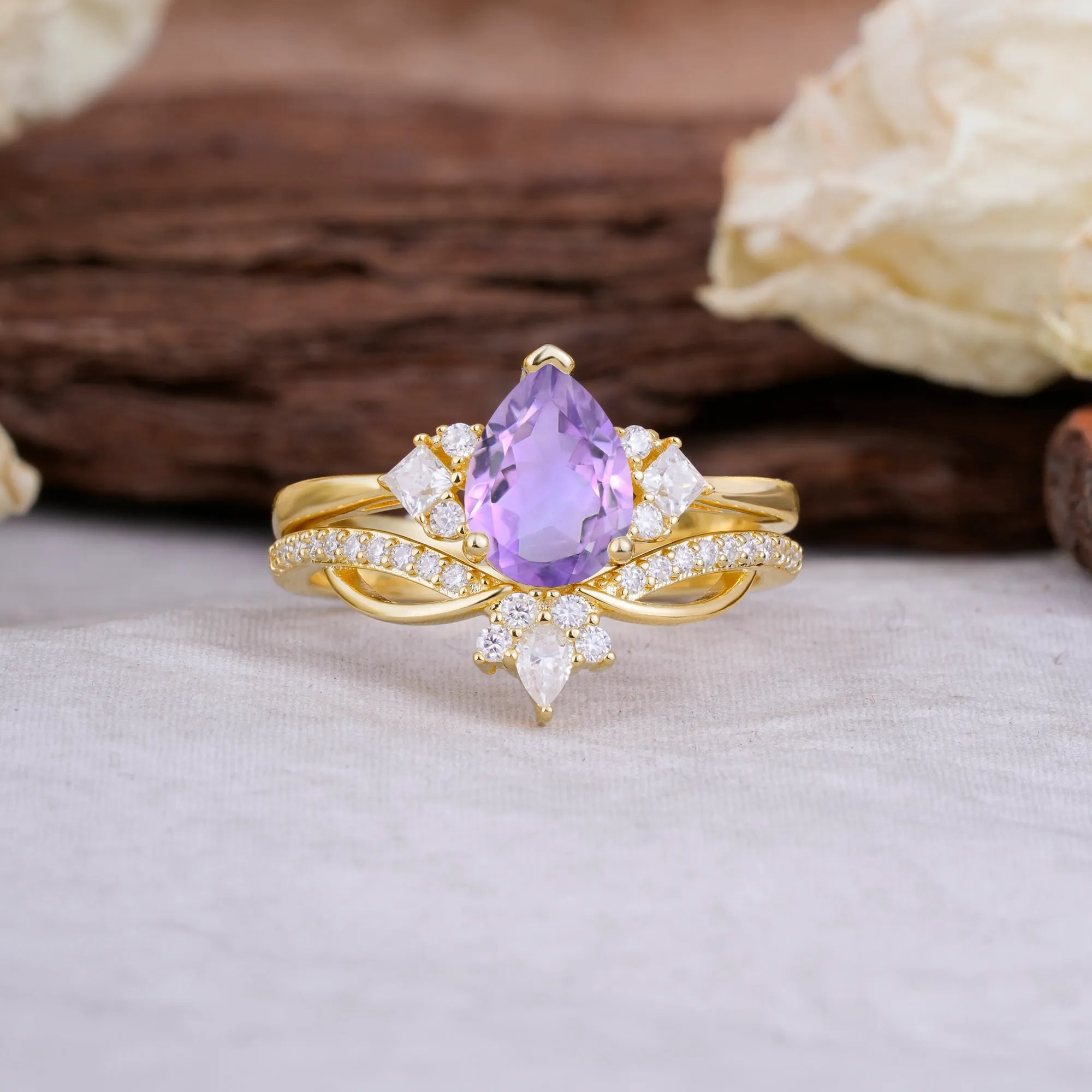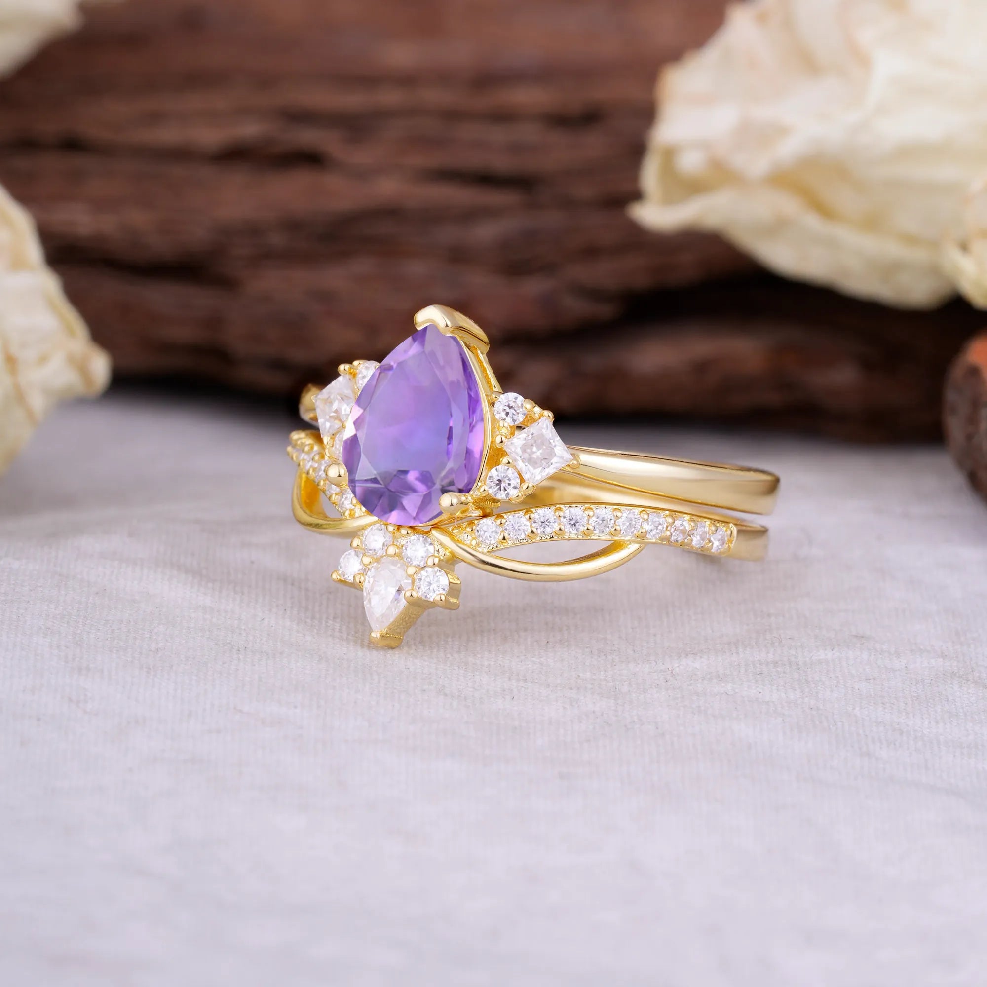 This captivating ring features a 0.92-carat natural Amethyst as its centerpiece, showcasing a rich Purple hue in an elegant Pear Cut. The primary stone's graceful teardrop shape highlights the amethyst's royal purple color, creating a sophisticated and mystical aesthetic. Surrounding it are 29 round brilliant-cut Lab Grown Moissanite side stones of D/E/F color and VVS1 clarity, meticulously set to frame and enhance the central gemstone's natural beauty. This design harmoniously blends natural gemstone elegance with modern sustainable materials, resulting in a distinctive piece that celebrates both traditional craftsmanship and contemporary values.