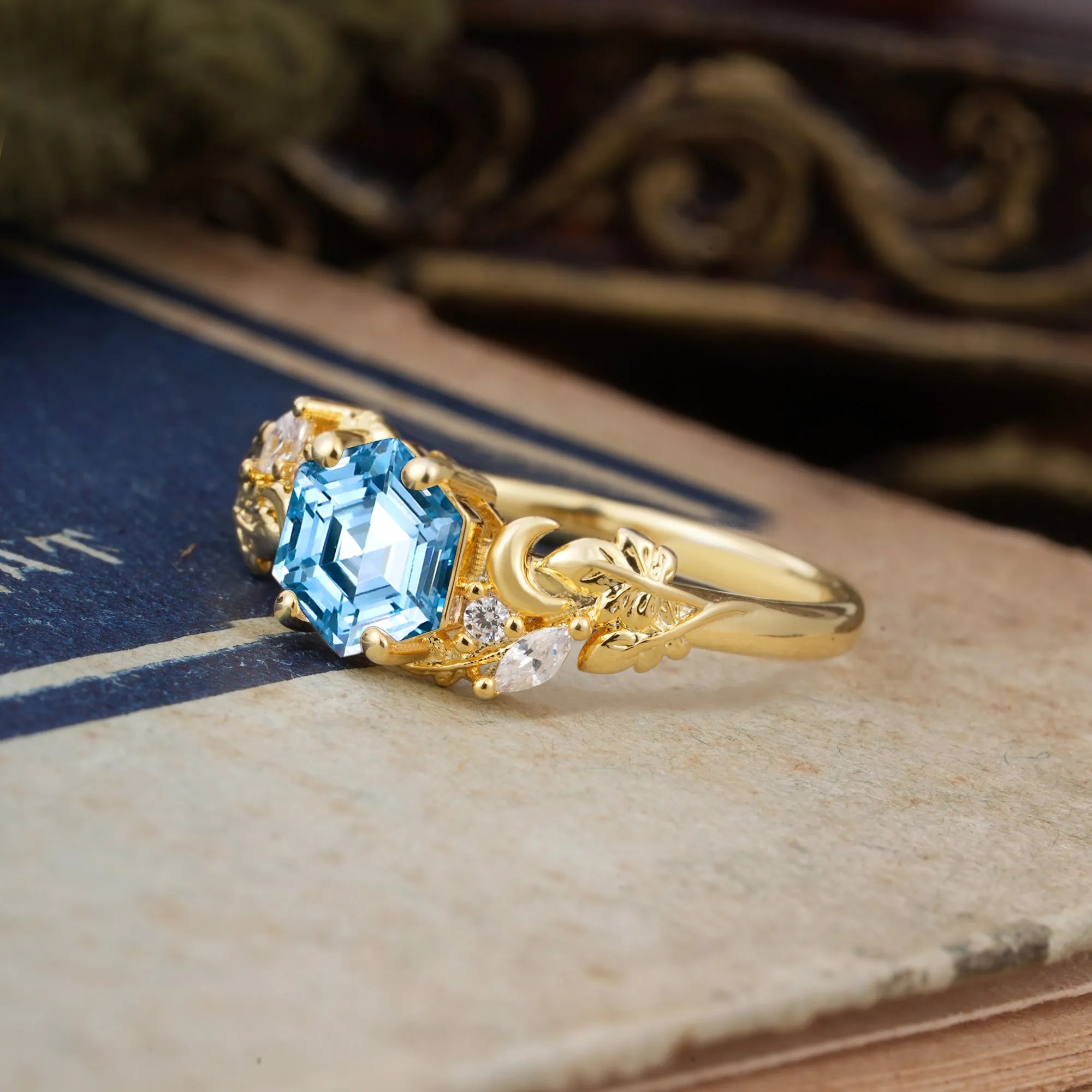 Fashion-Forward Hexagon Cut Aquamarine Engagement Ring - 4-Prong Nature-Inspired Design