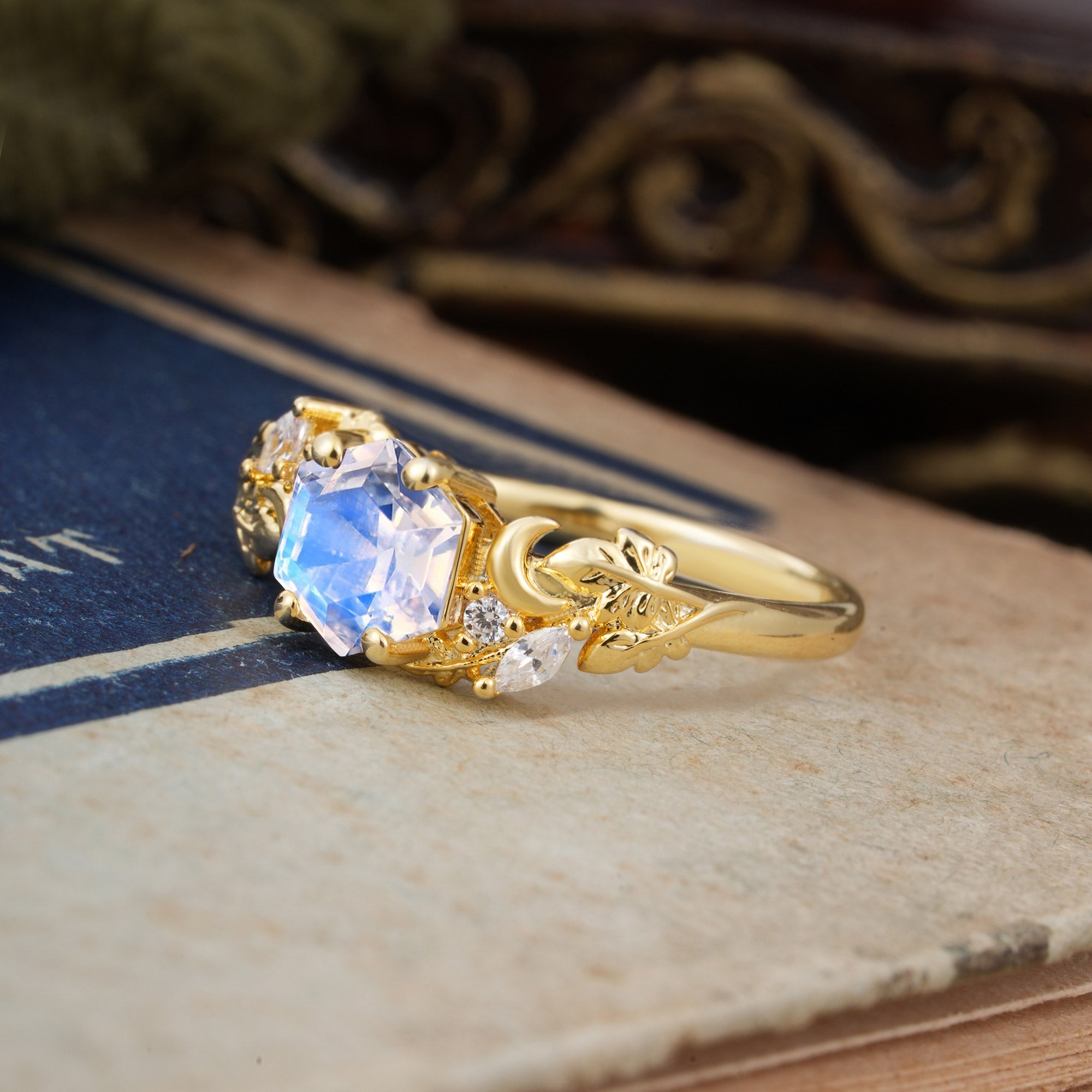 Fashion-Forward Hexagon Cut Natural Moonstone Engagement Ring - 4-Prong Nature-Inspired Design