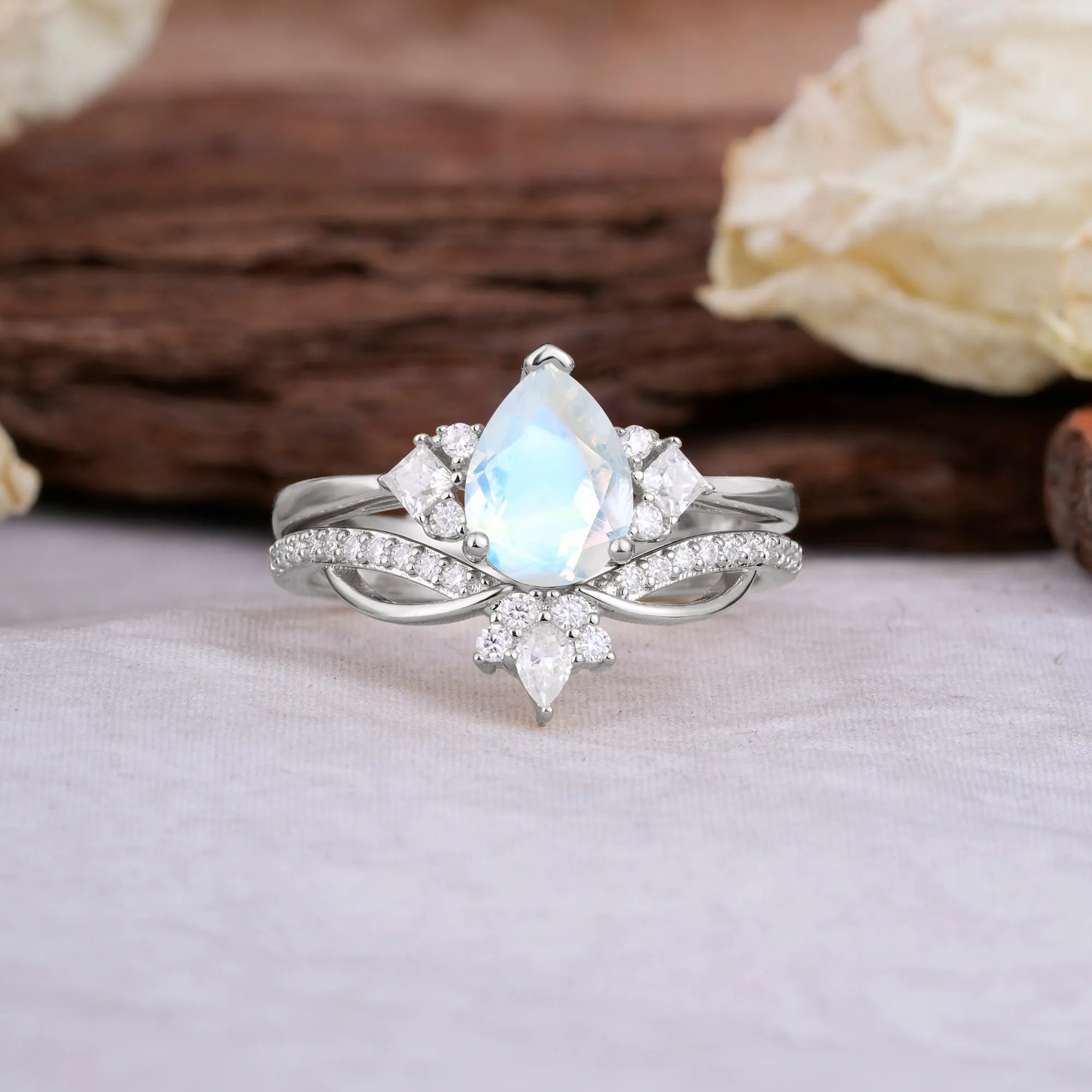 Fashion-Forward Luxury Pear-Cut Moonstone Engagement Ring Set