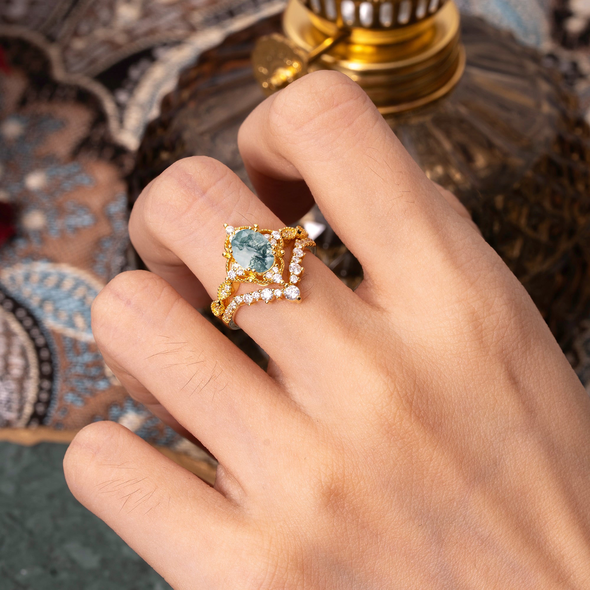 | Stone Material: Moss Agate | Stone Material: Moissanite |