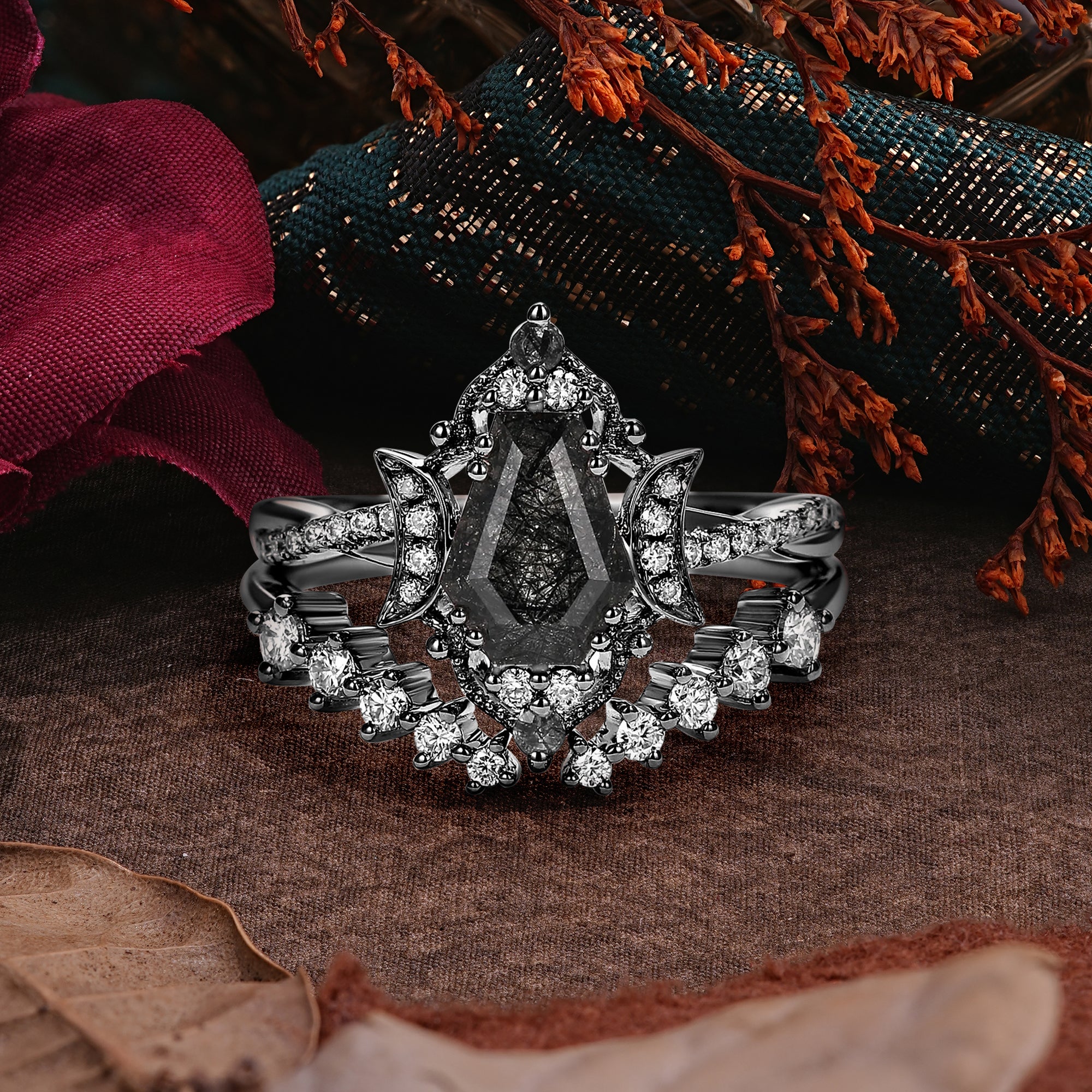 Halloween Limited-Crescent Moon | Coffin Cut luxurious Black Rutilated Quartz Black Ring Set