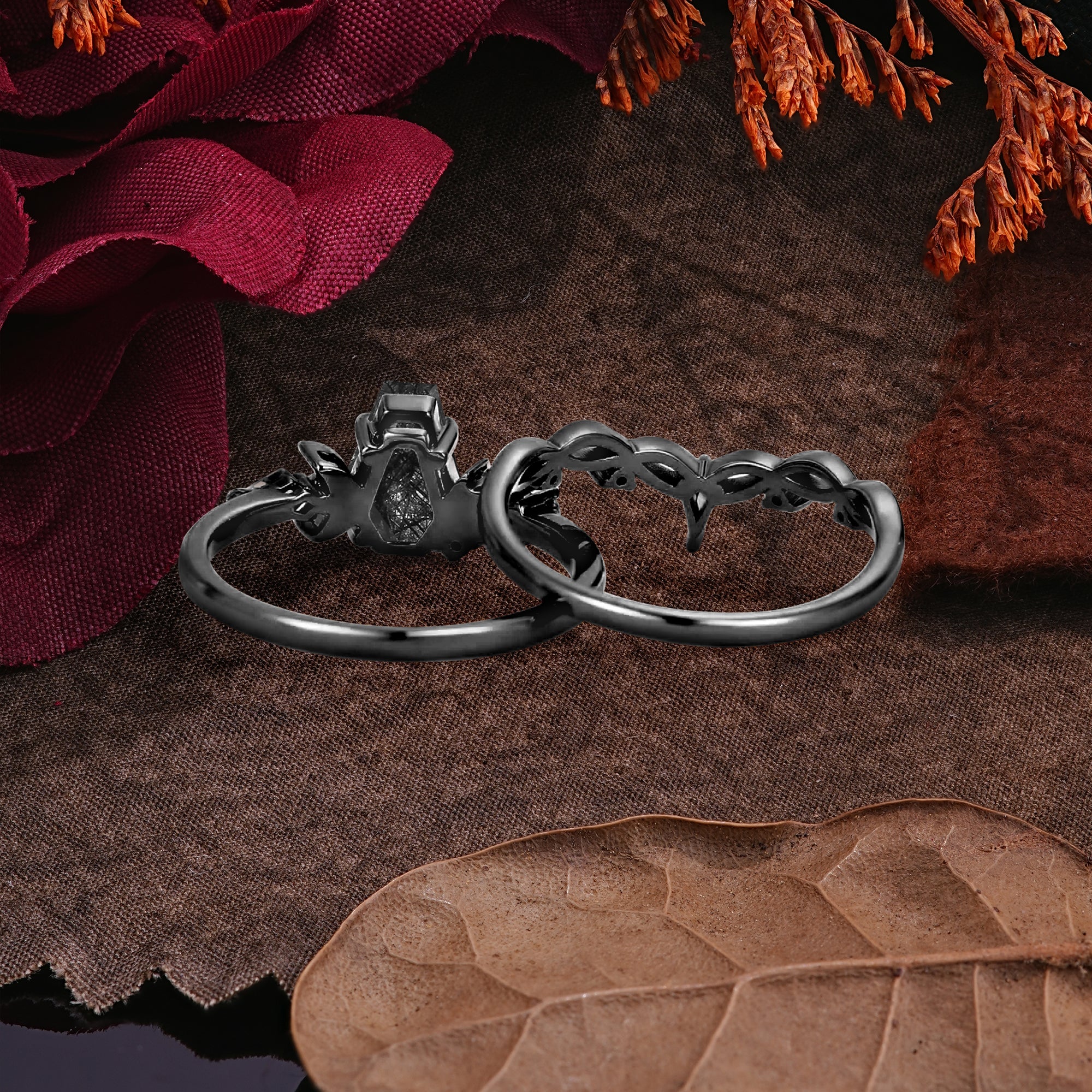 | Stone Material: Black Rutilated Quartz | Stone Material: Moissanite, Ruby |