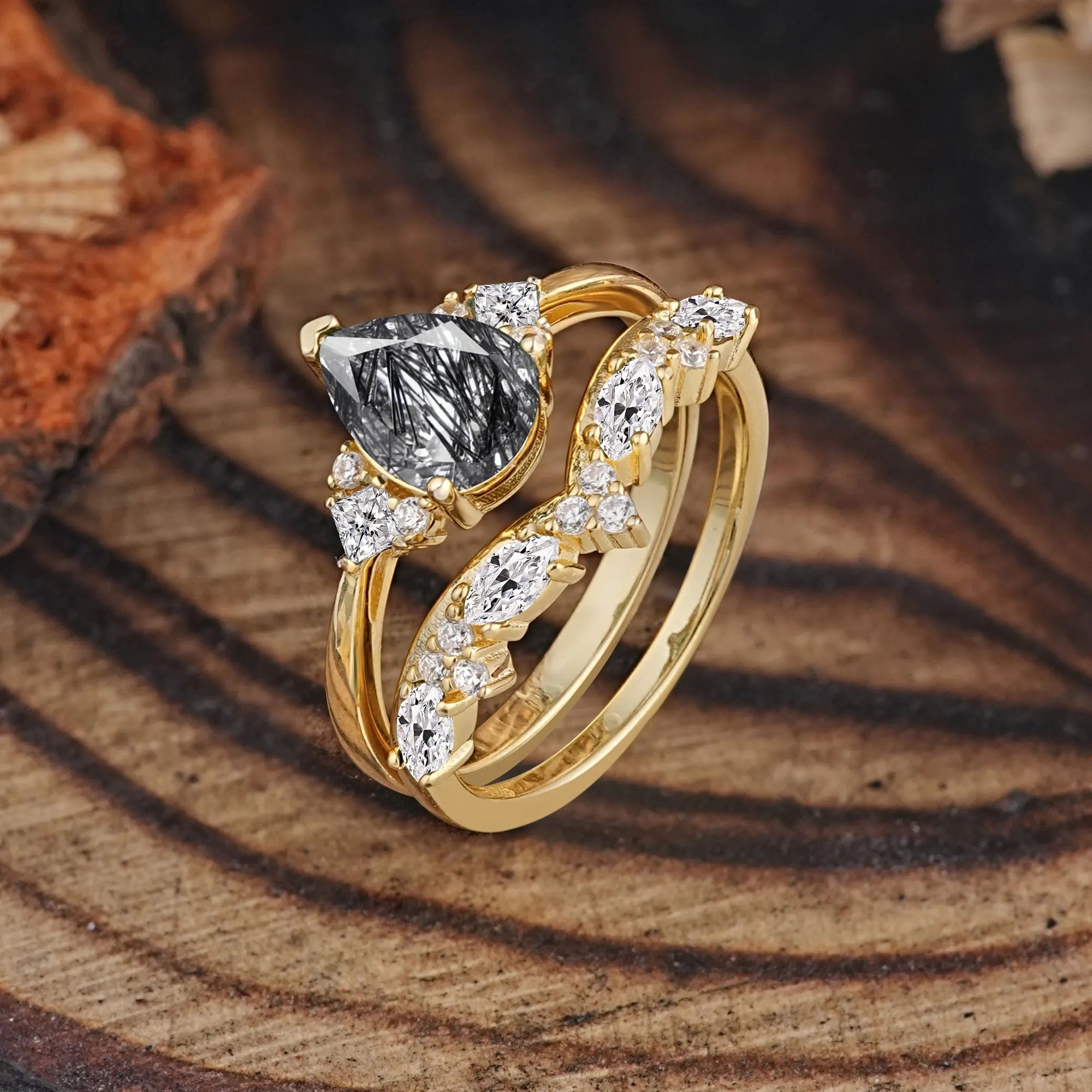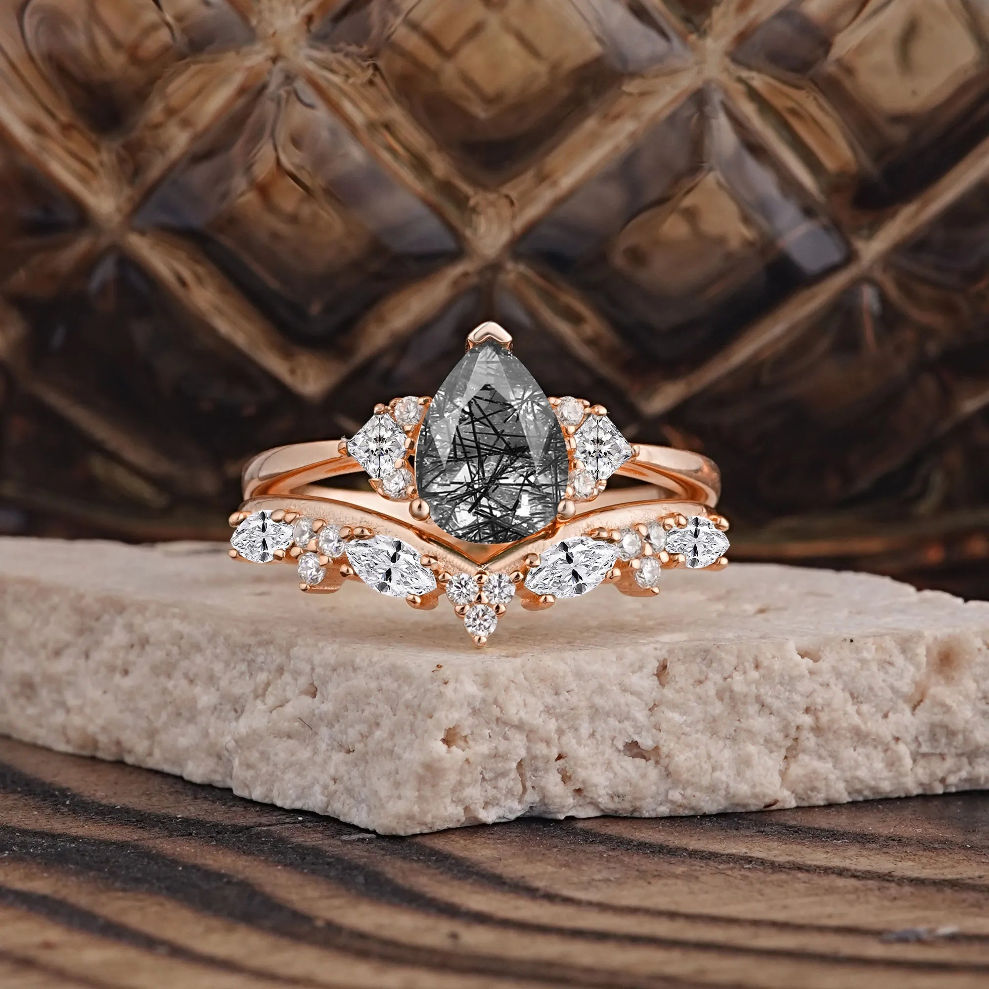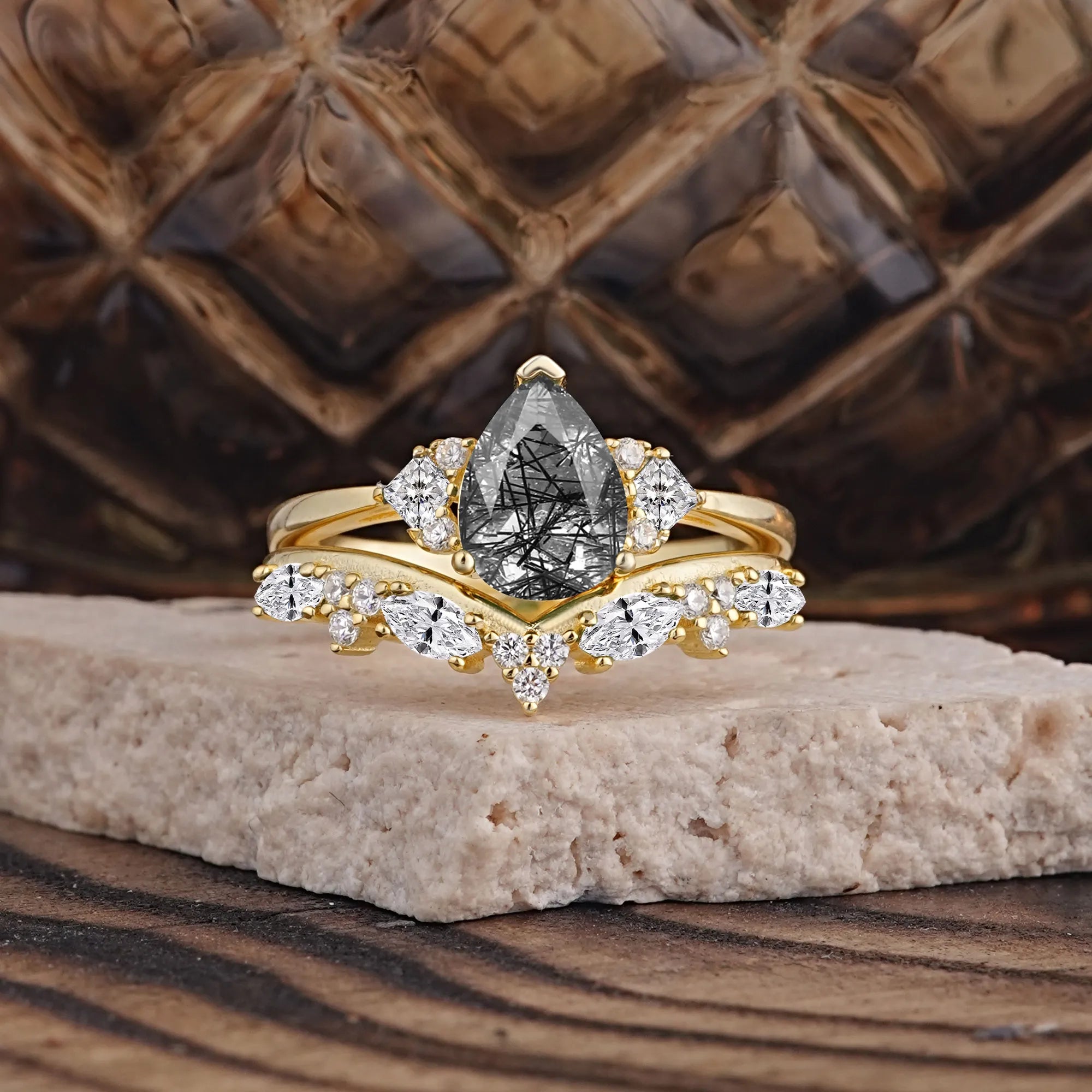 Luxury 3-Prong Pear-Cut Black Rutilated Quartz Engagement Ring Set