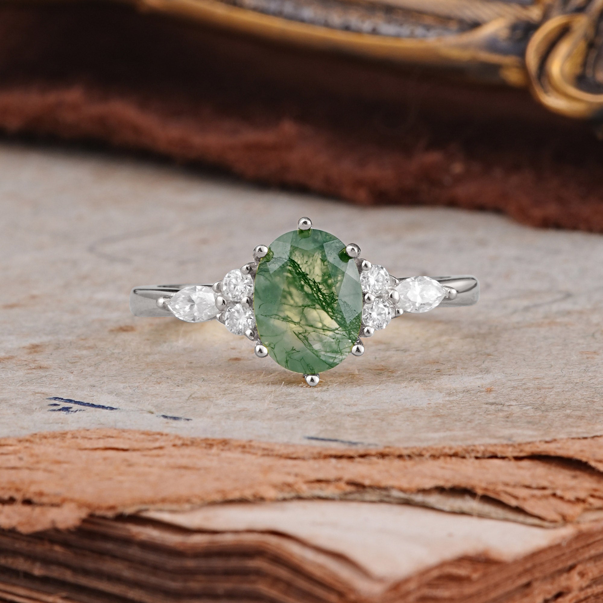 | Stone Material: Moss Agate | Stone Material: Moissanite | |