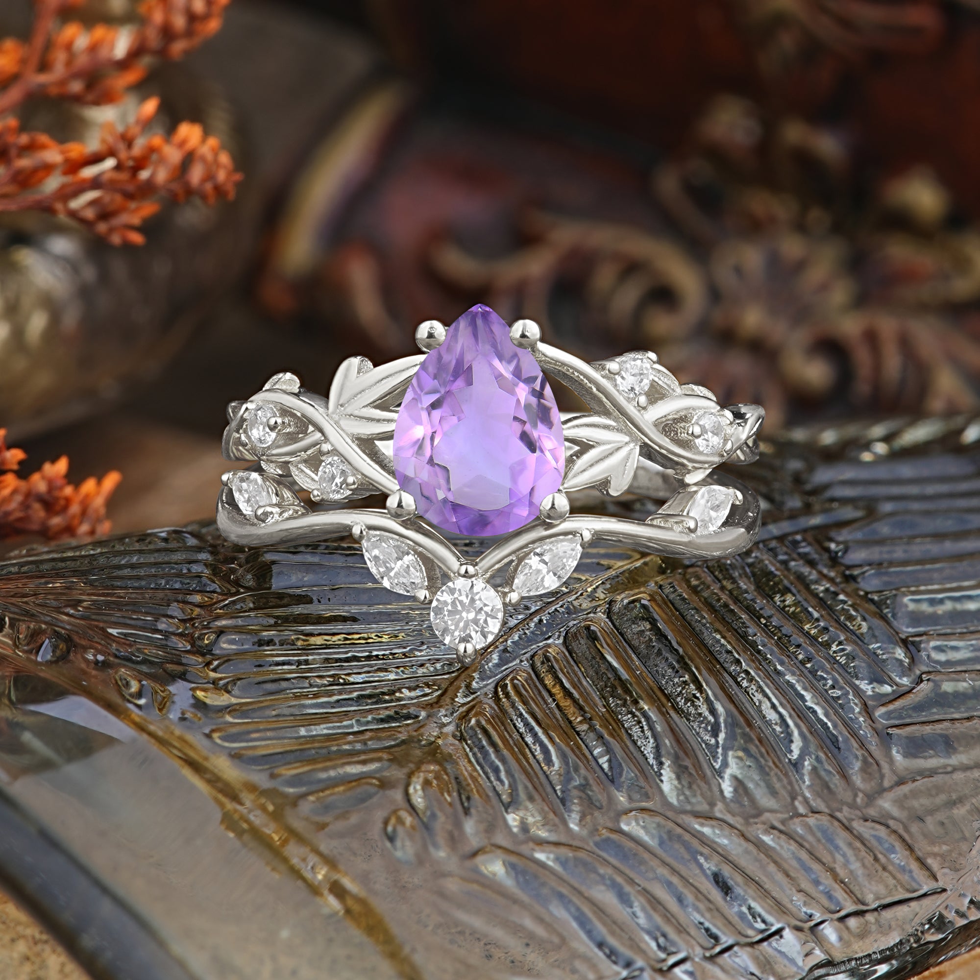 Luxury Nature-Inspired Pear Cut Vintage White 4 Prong Amethyst Ring Pave Engagement Ring Set