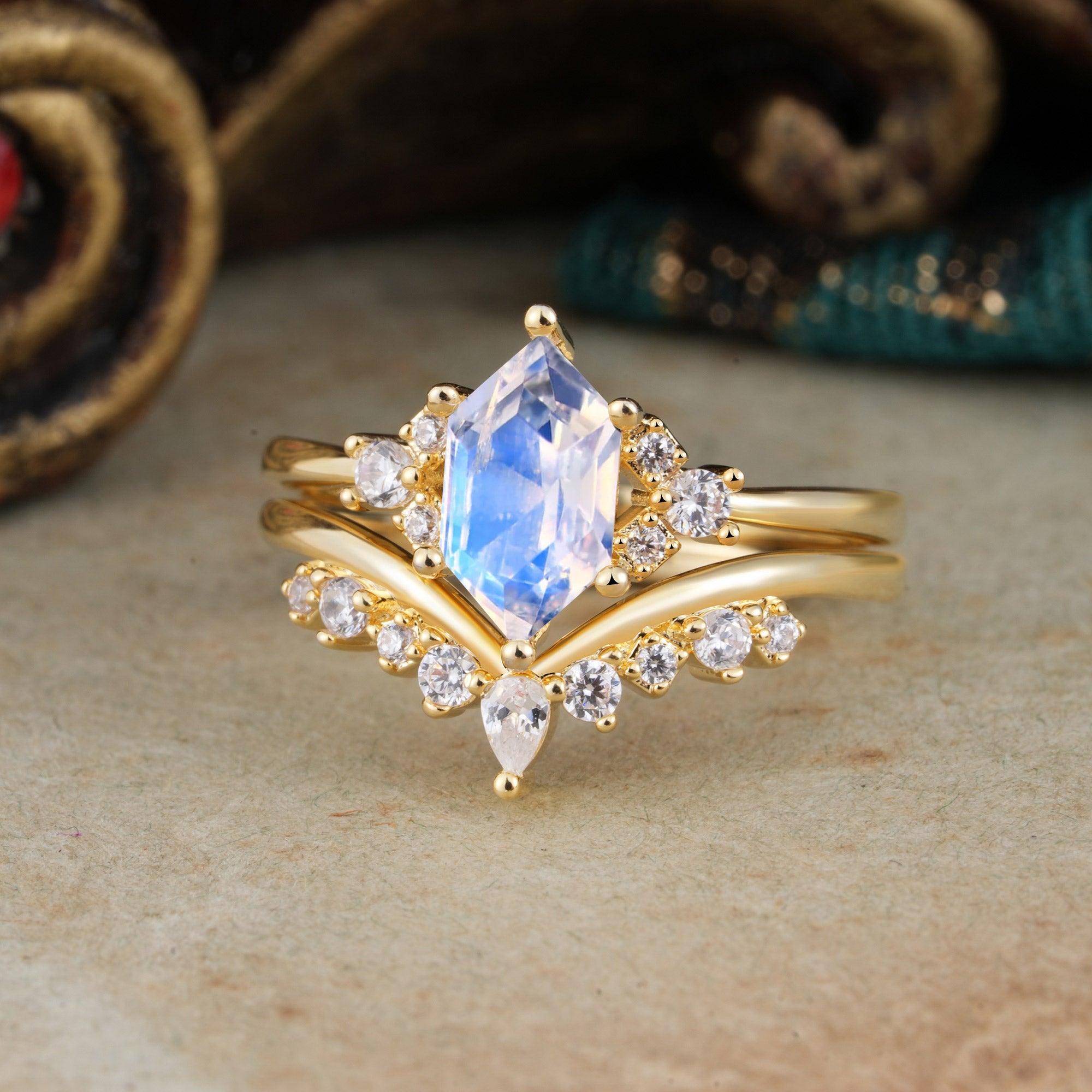 Luxury Vintage Classic 6-Prong Hexagonal-Cut Moonstone Engagement Ring Set