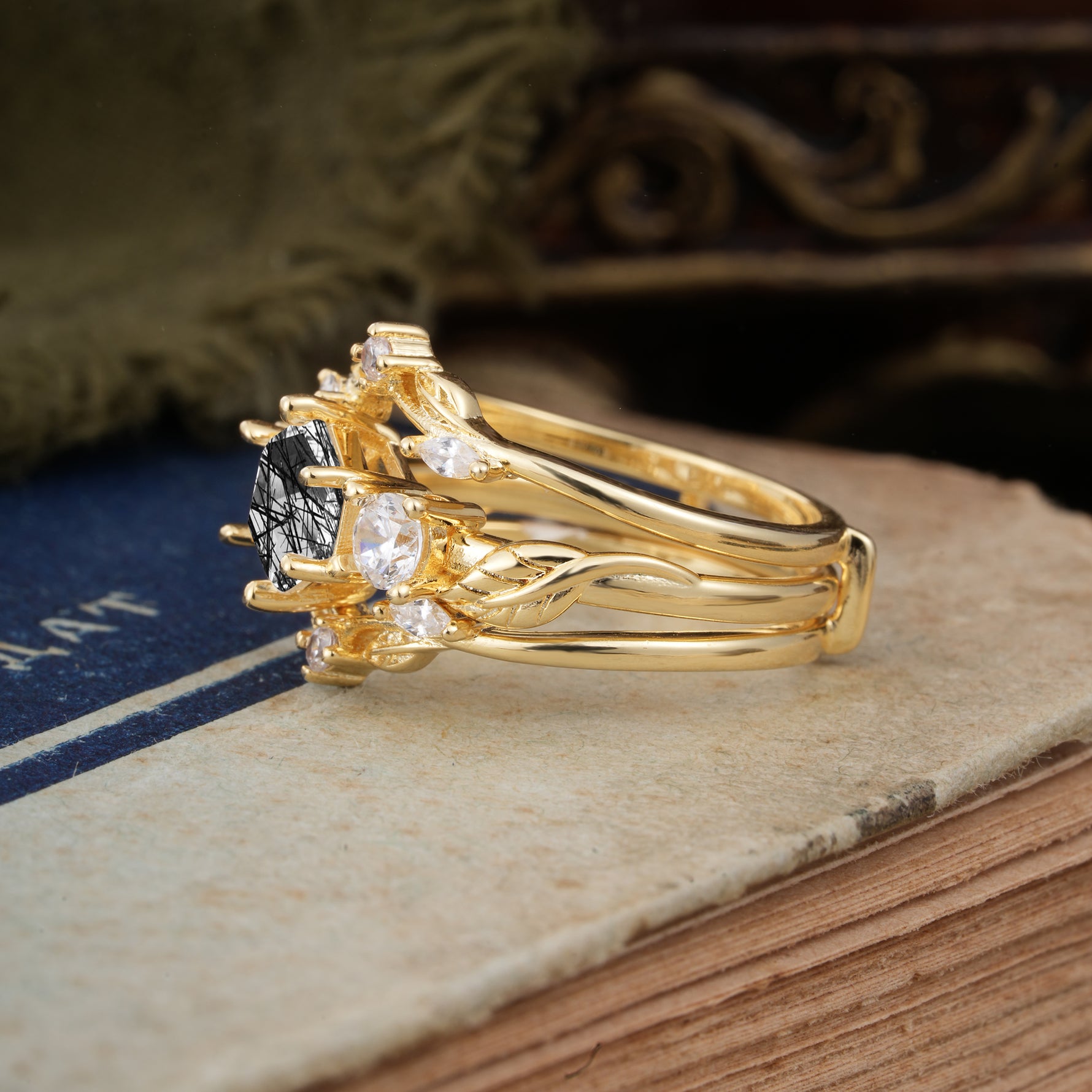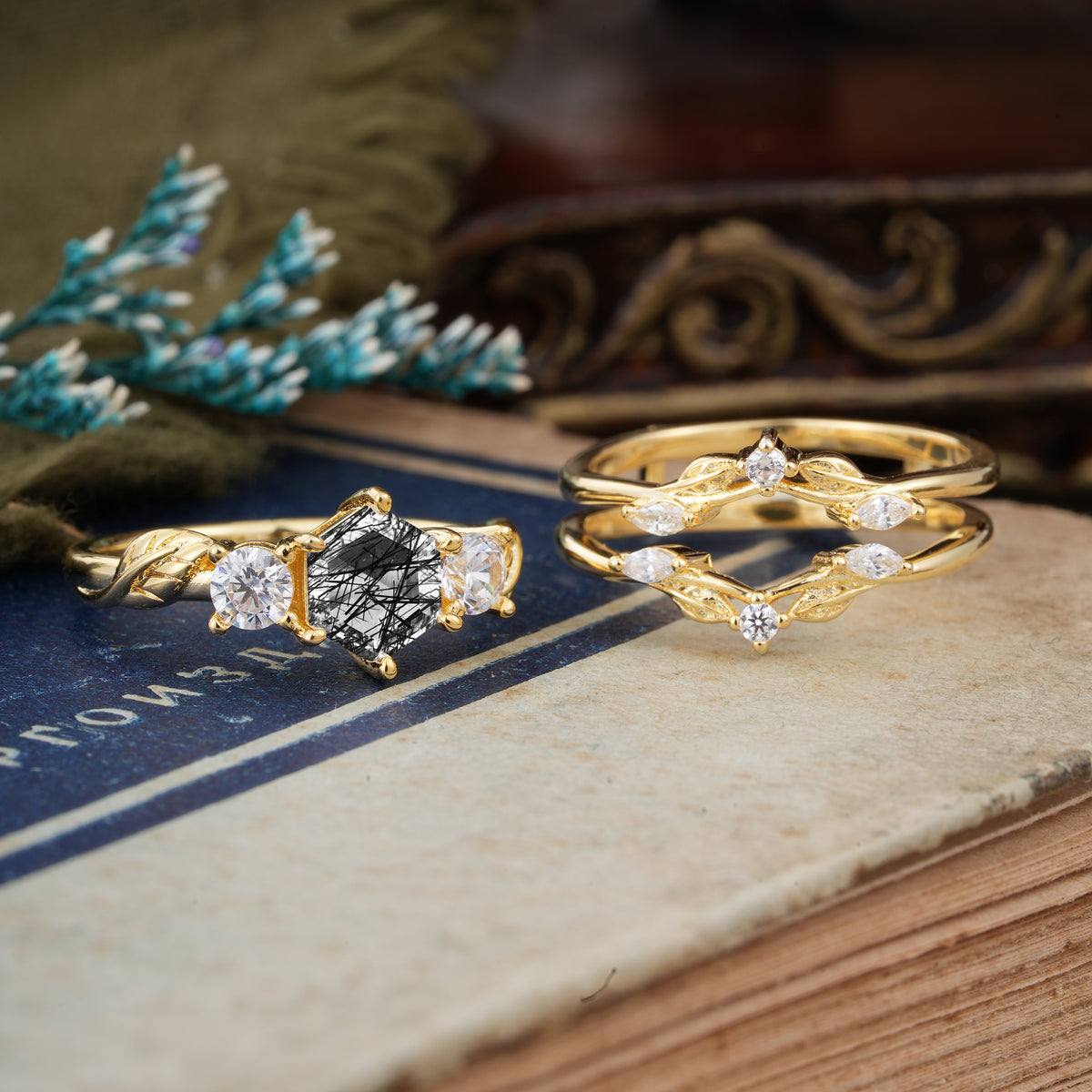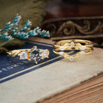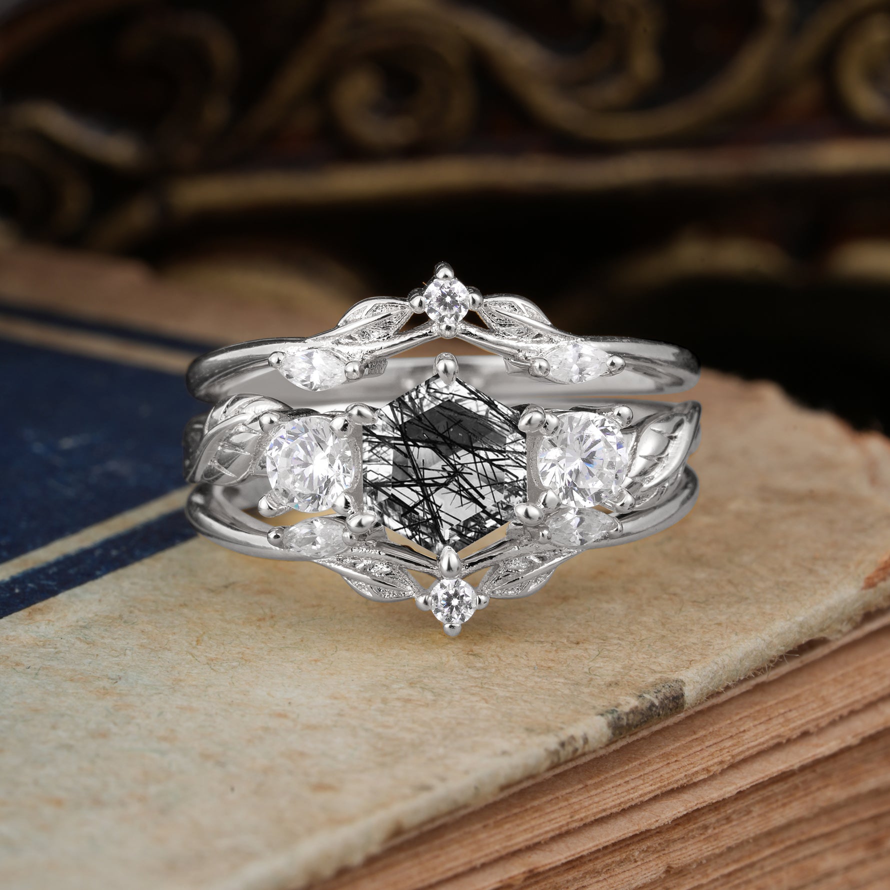 Natural Inspiration Luxury Botanical Hexagon Cut Black Rutilated Quartz Engagement Ring Suite