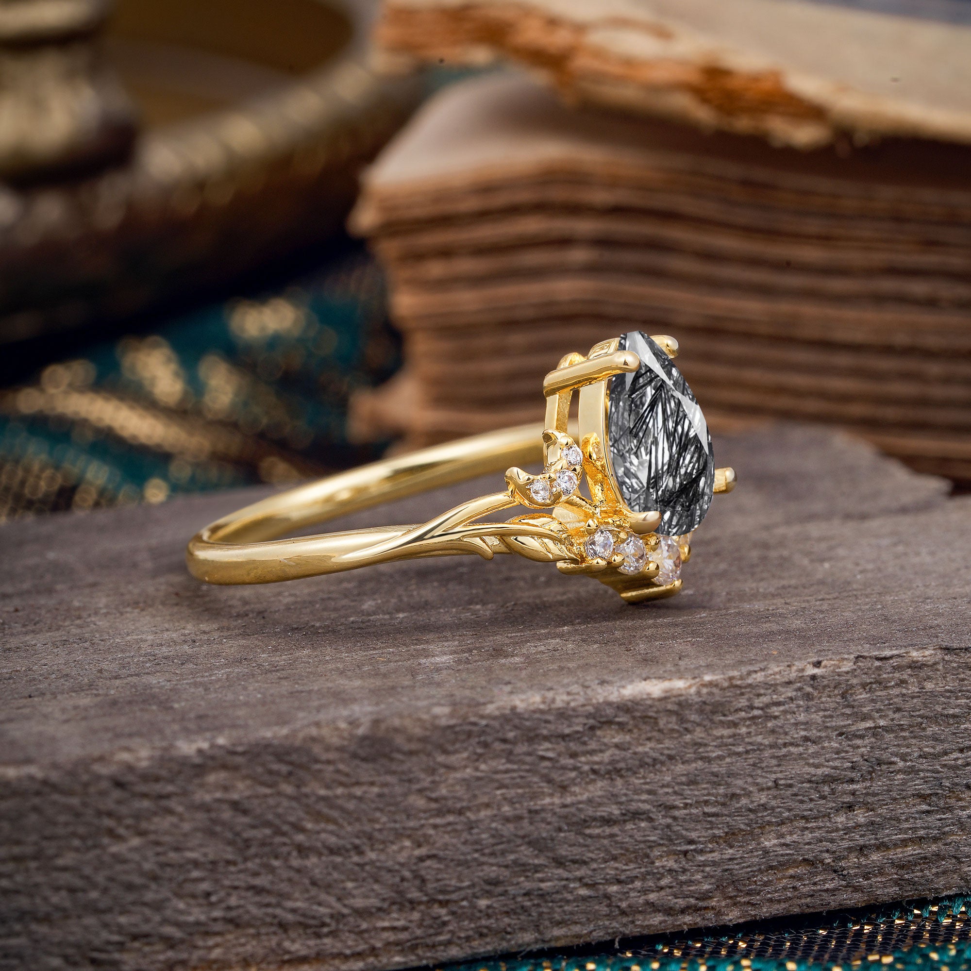Nature and Moon-Inspired 4-Prong Pear-Cut Natural Black Rutilated Quartz Engagement Ring