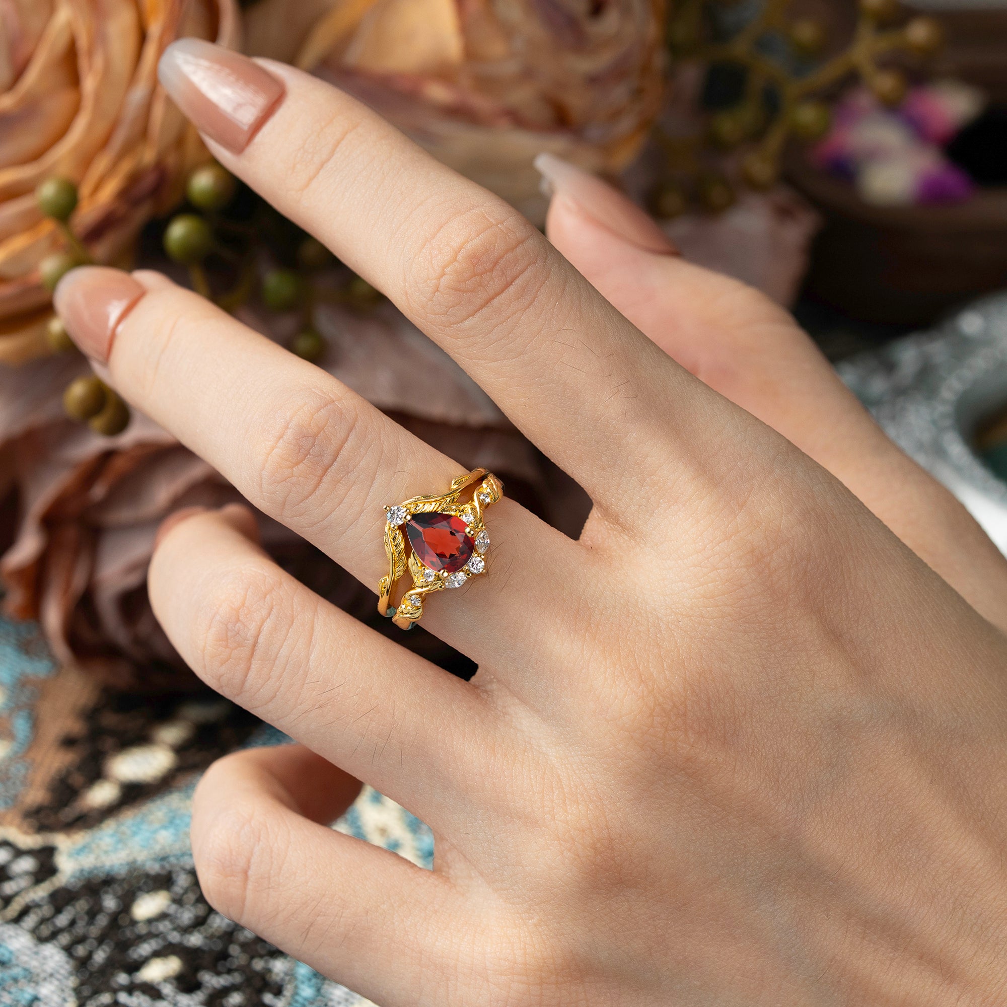 Nature-Inspired 3-Prong Tear-Cut Garnet Engagement Ring Set