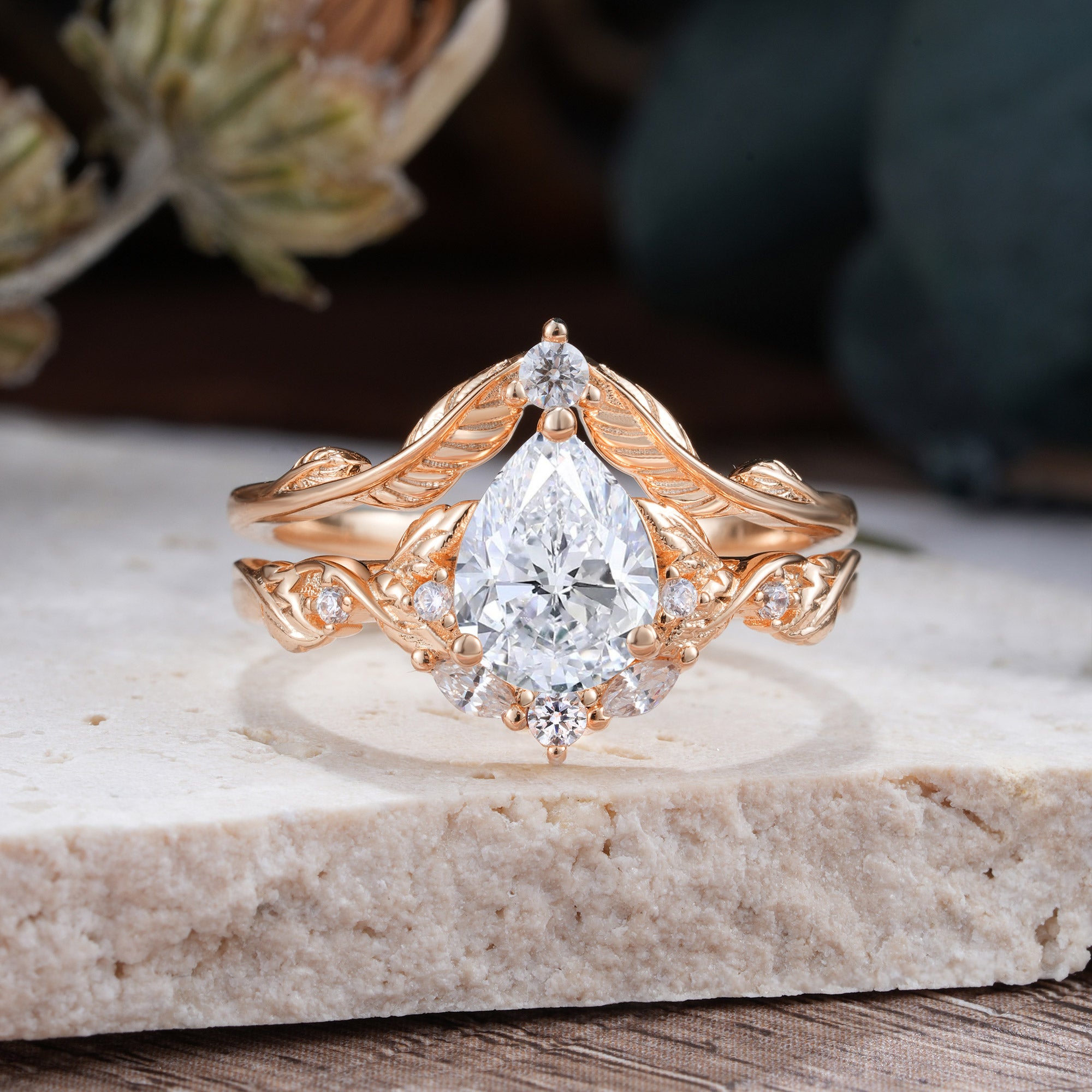 Nature-Inspired 3-Prong Tear-Cut Lab Diamond Engagement Ring Set