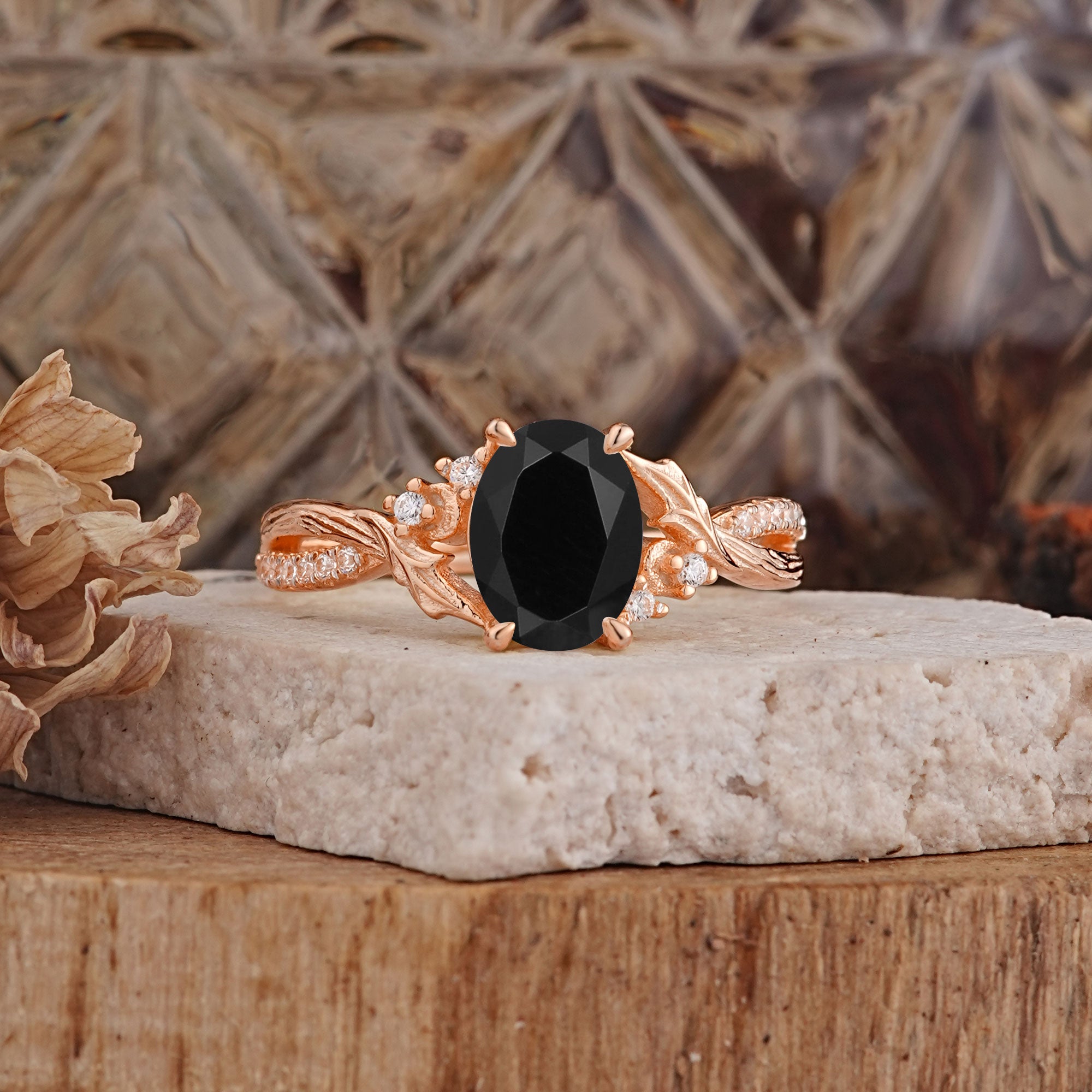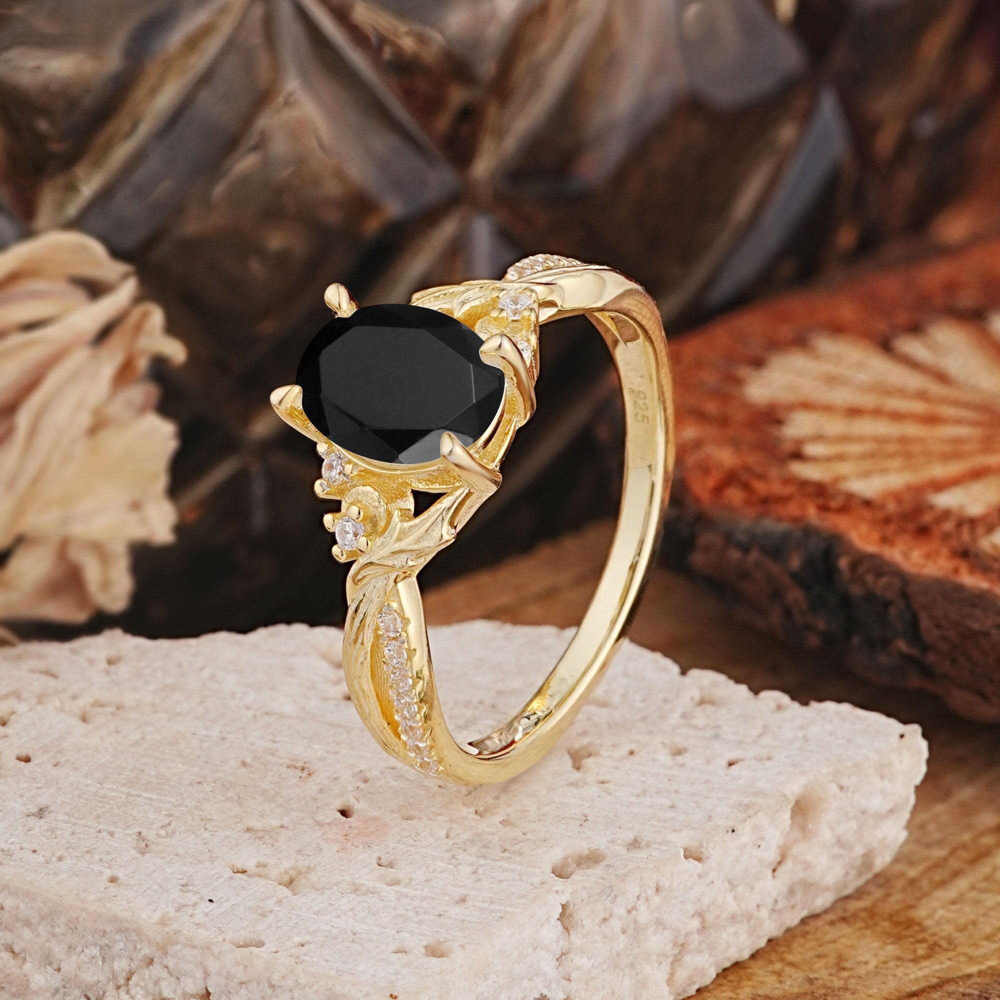 Nature Inspired 4 Prong Golden Vine Oval Cut Black Onyx Ring