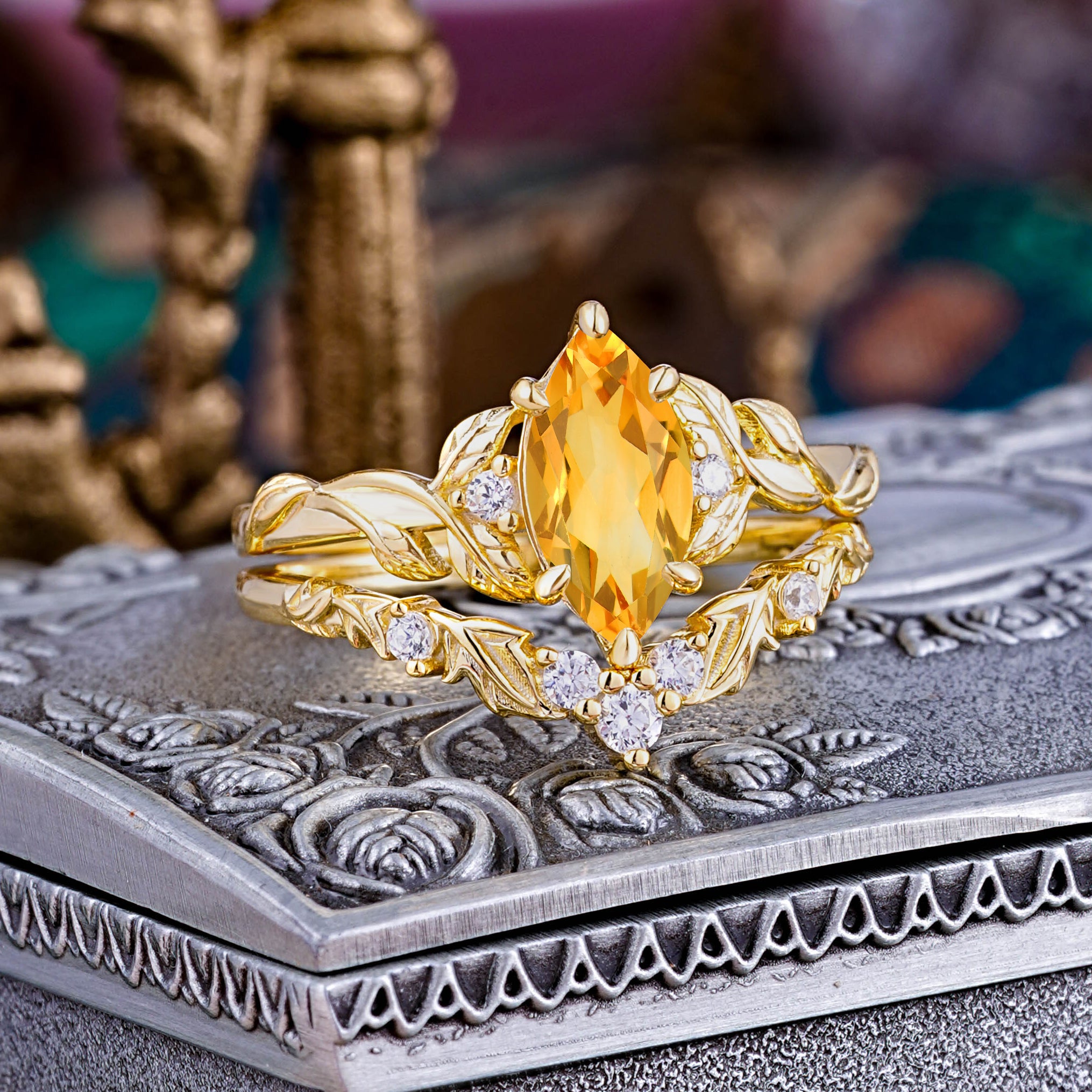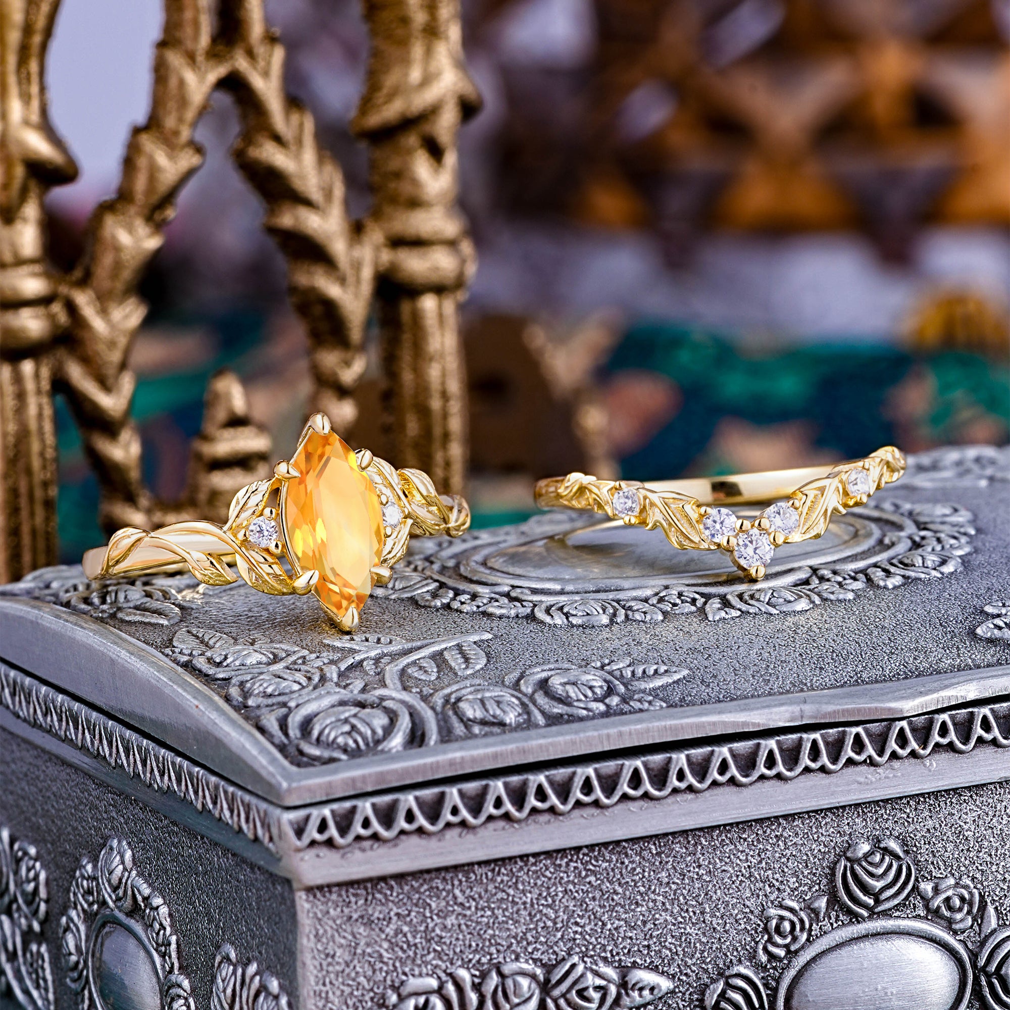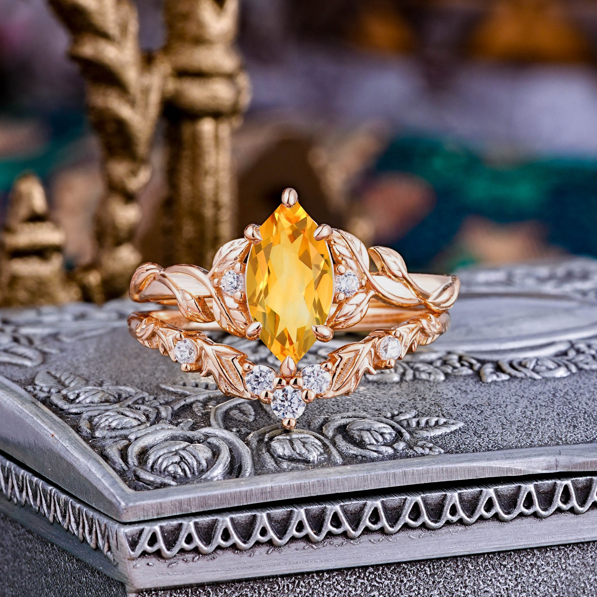 Nature-Inspired 6 Prong Marquise Citrine Engagement Ring Set with Vine Motif