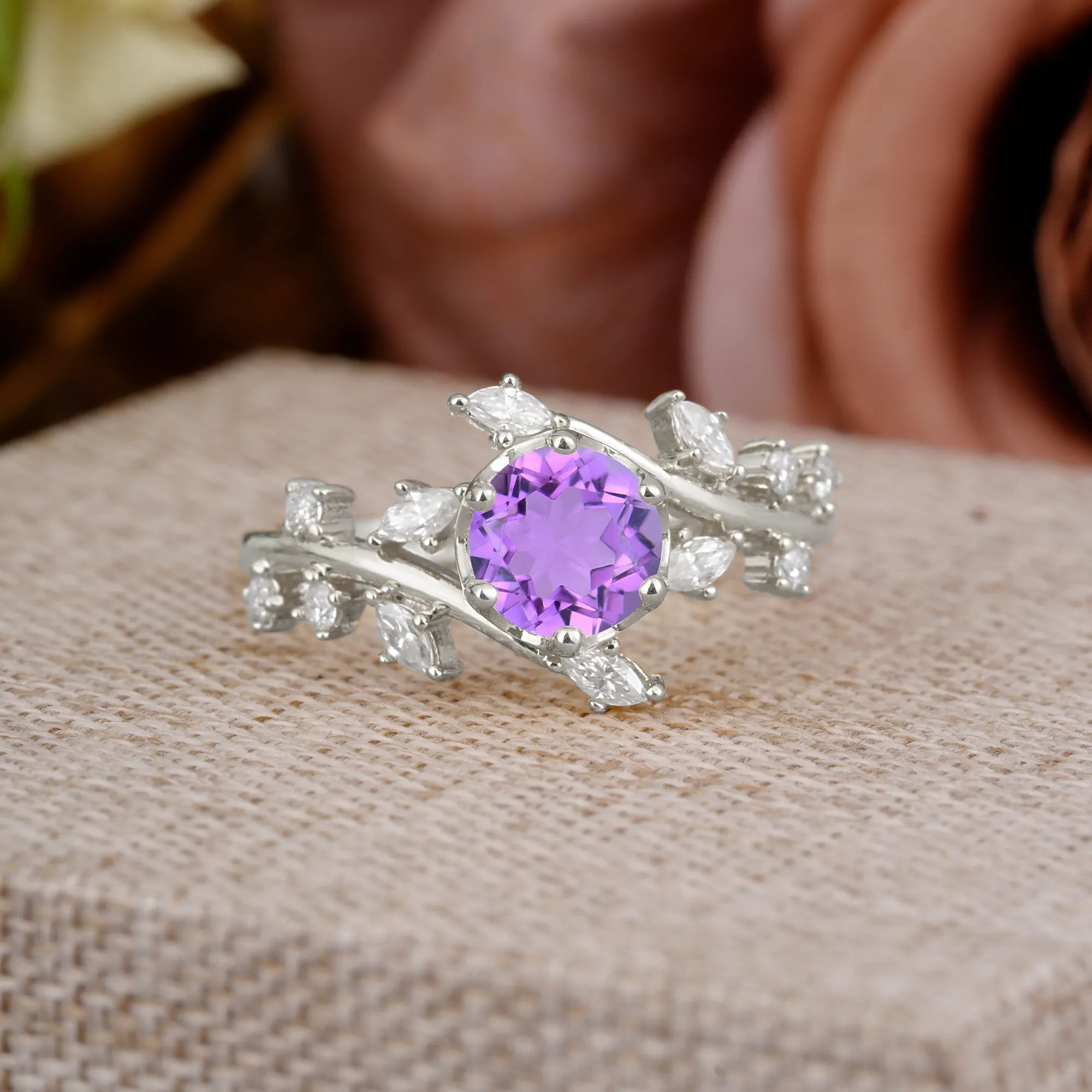 Nature-Inspired 6 Prong Round Cut Amethyst Ring