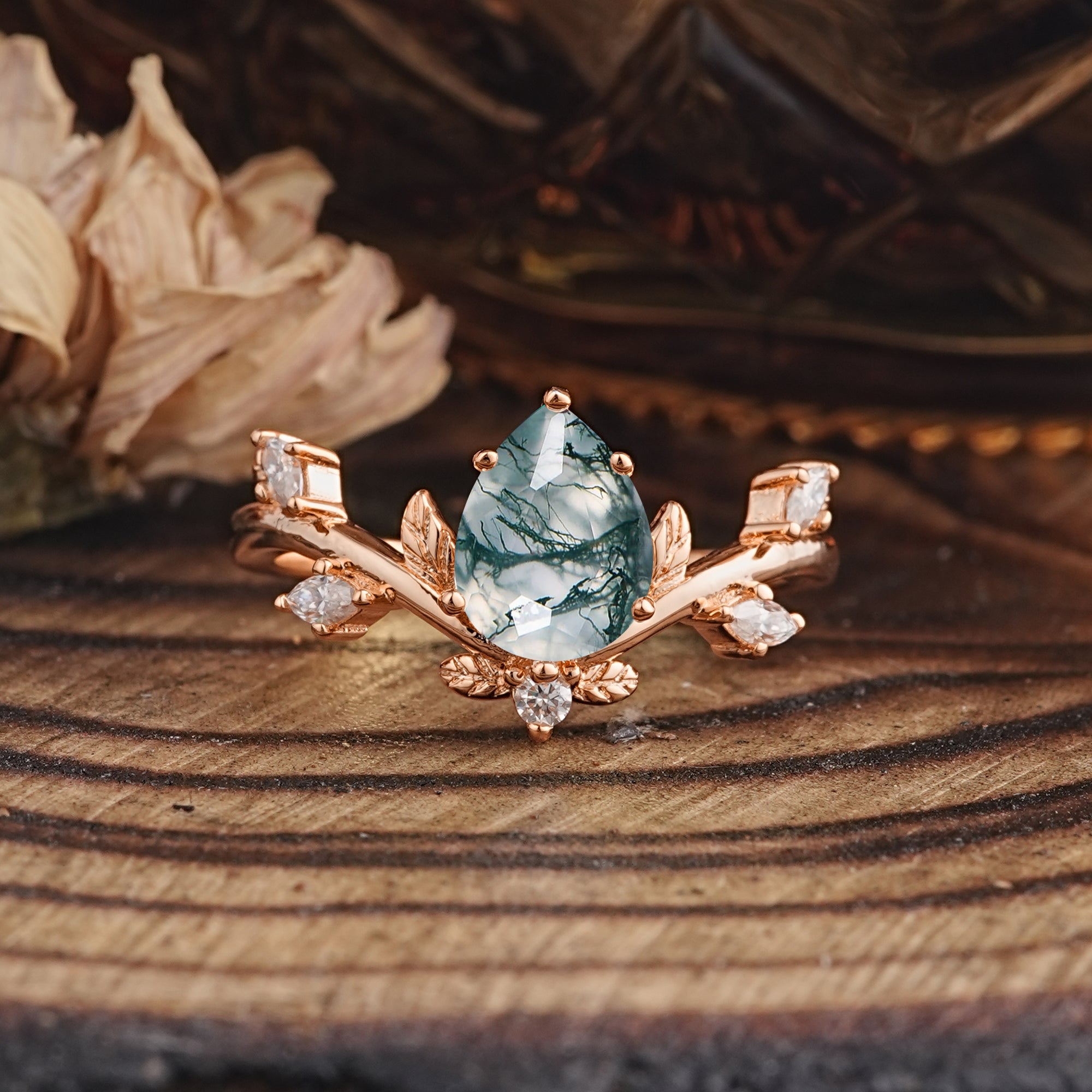 Nature-Inspired 6-Prong Teardrop Natural Moss Agate Engagement Ring