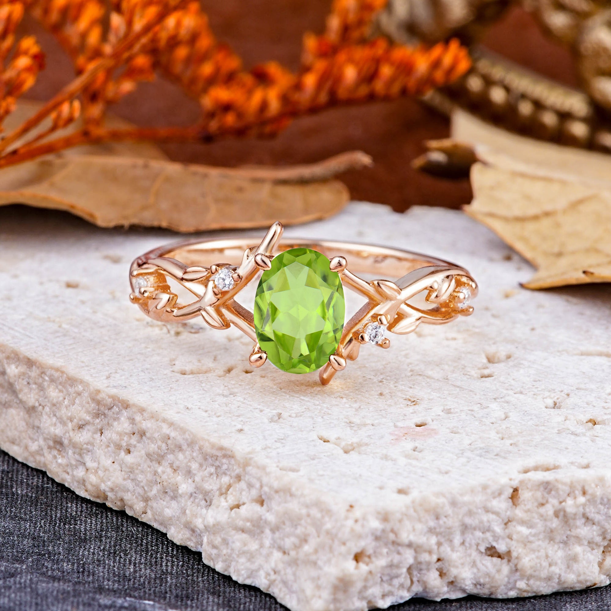 Nature-Inspired Branch-Wrapped 4-Prong Oval Peridot Engagement Rings