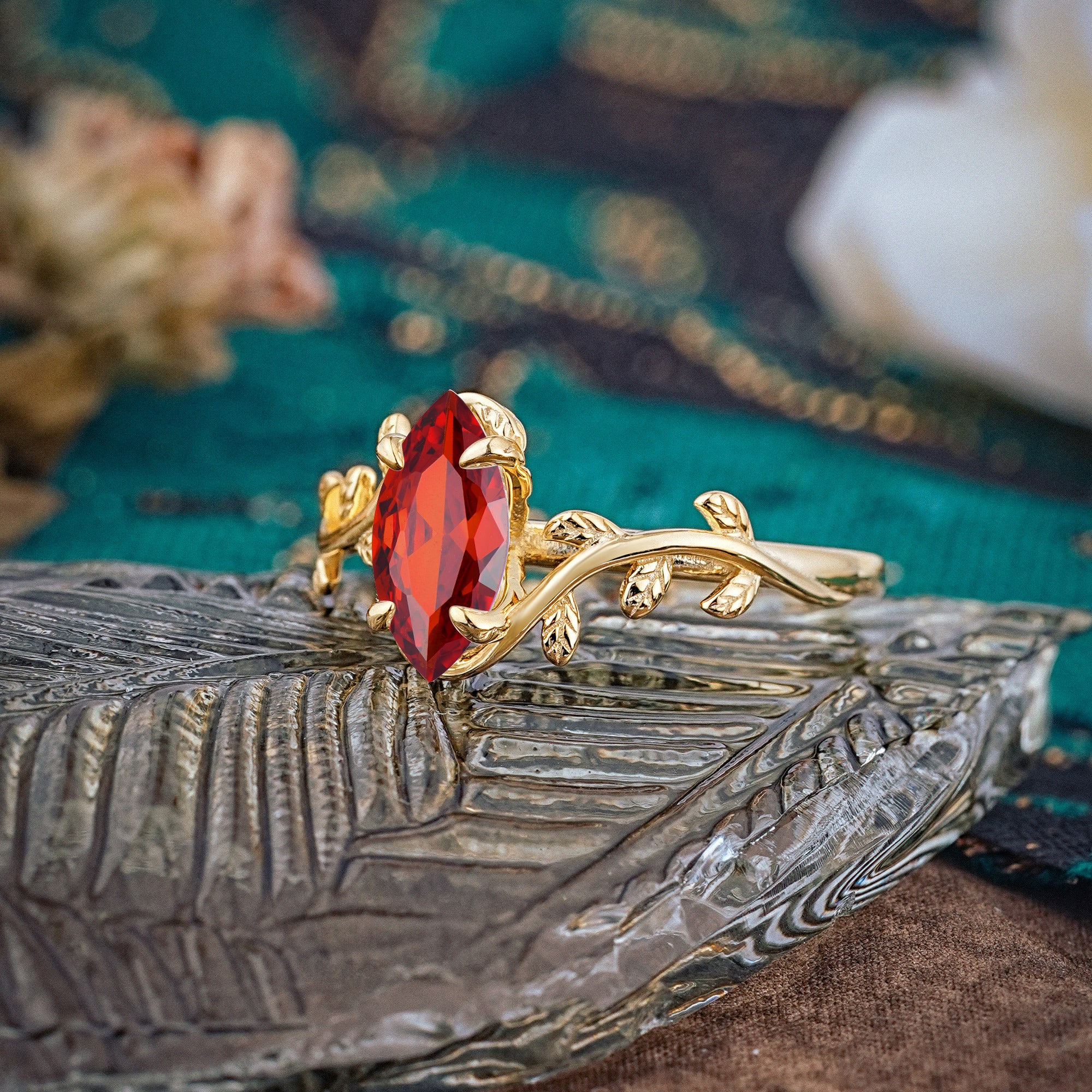 Nature-Inspired Leafy Branch 4-Prong Marquise Garnet Engagement Ring