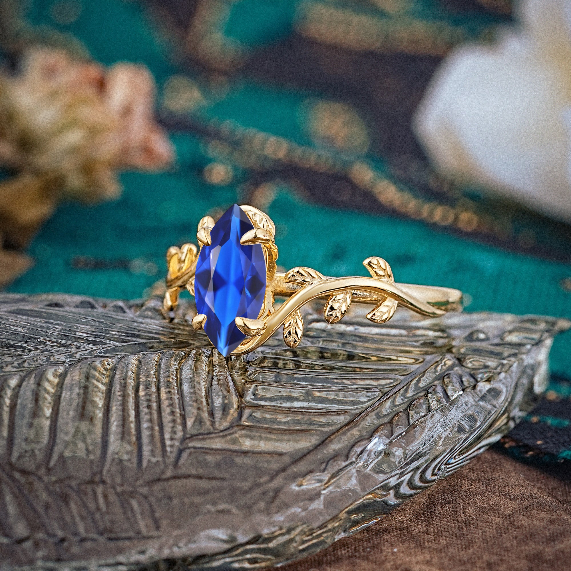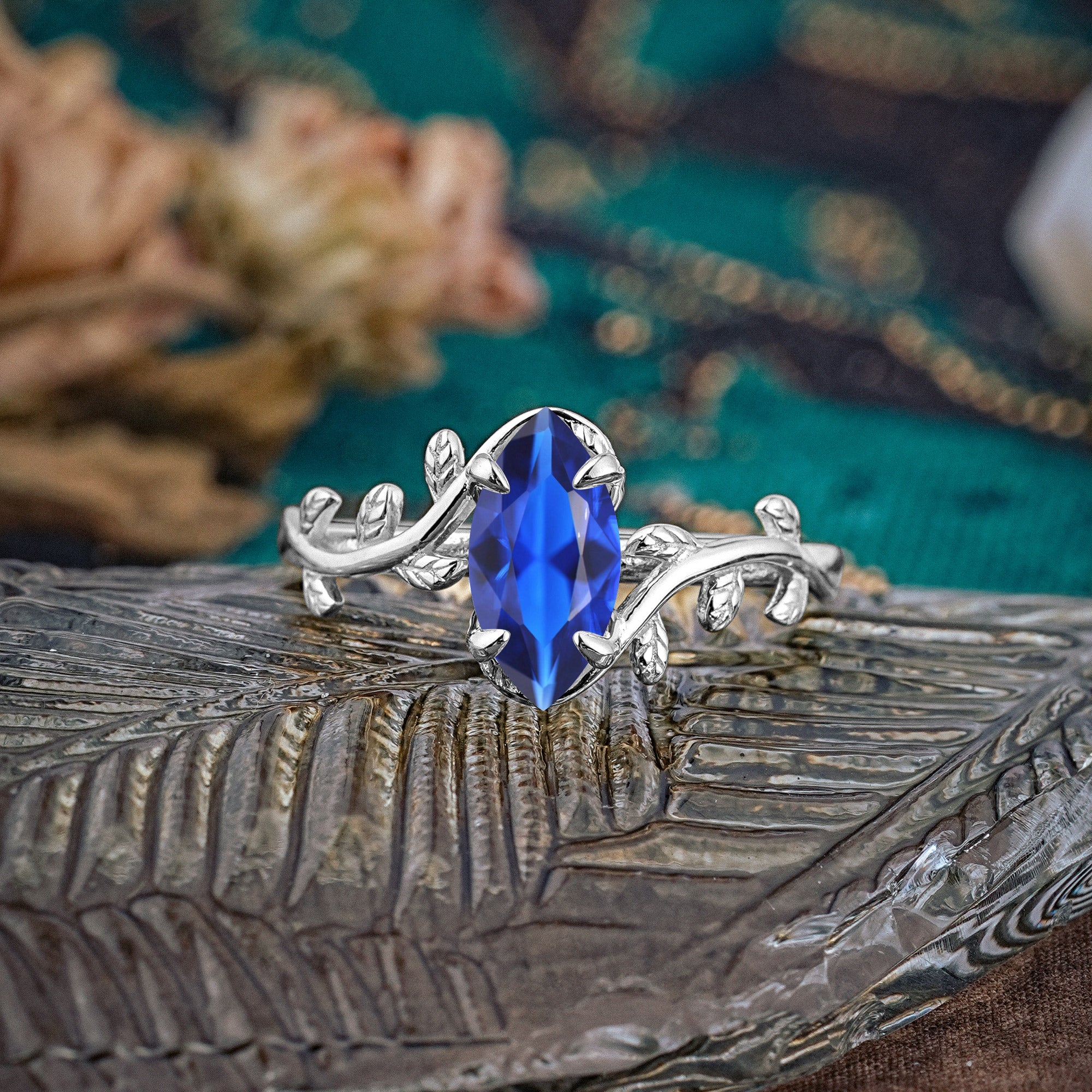 Nature-Inspired Leafy Branch 4-Prong Marquise Sapphire Engagement Ring