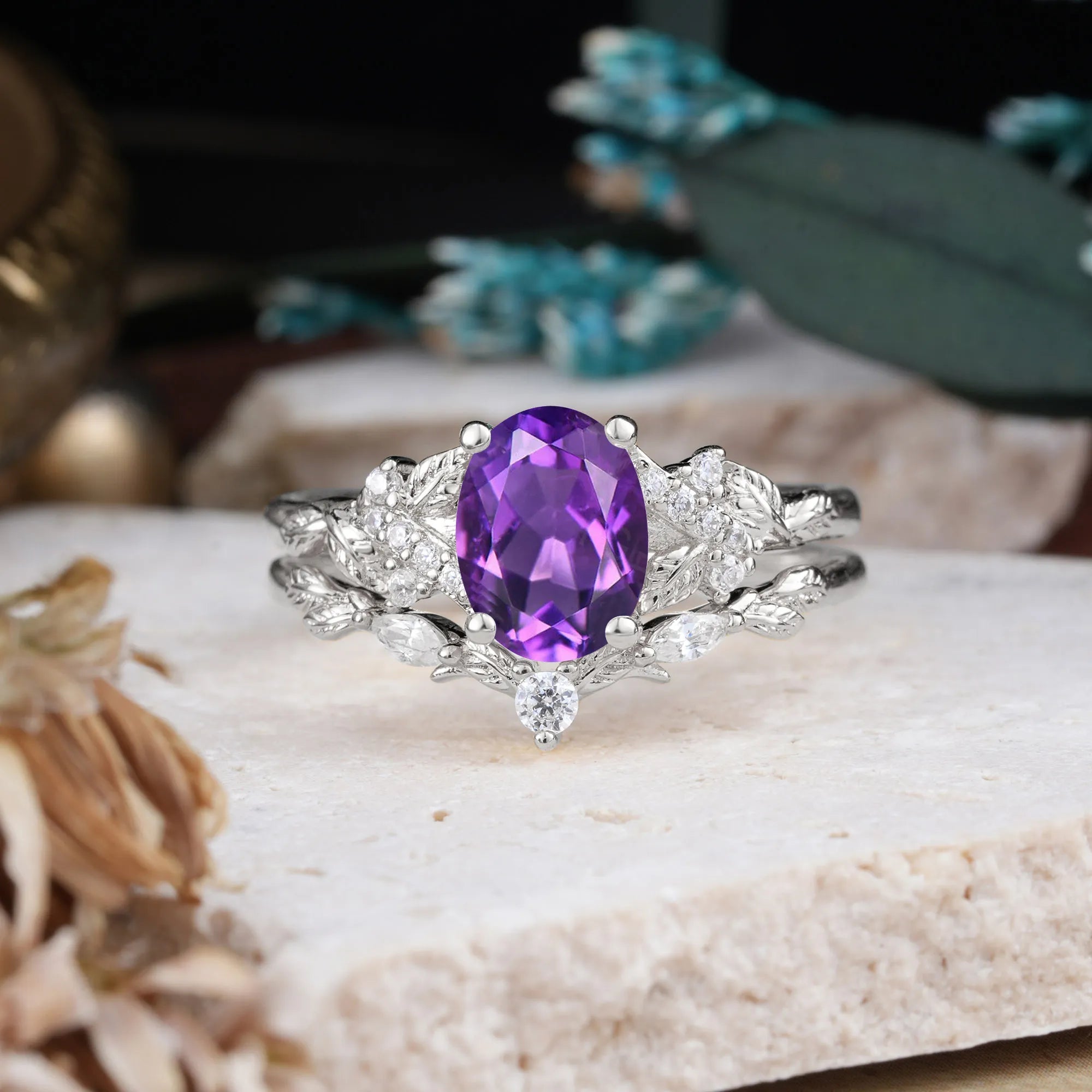 Nature-Inspired Luxury 4-Prong Oval-Cut Amethyst Engagement Ring Set