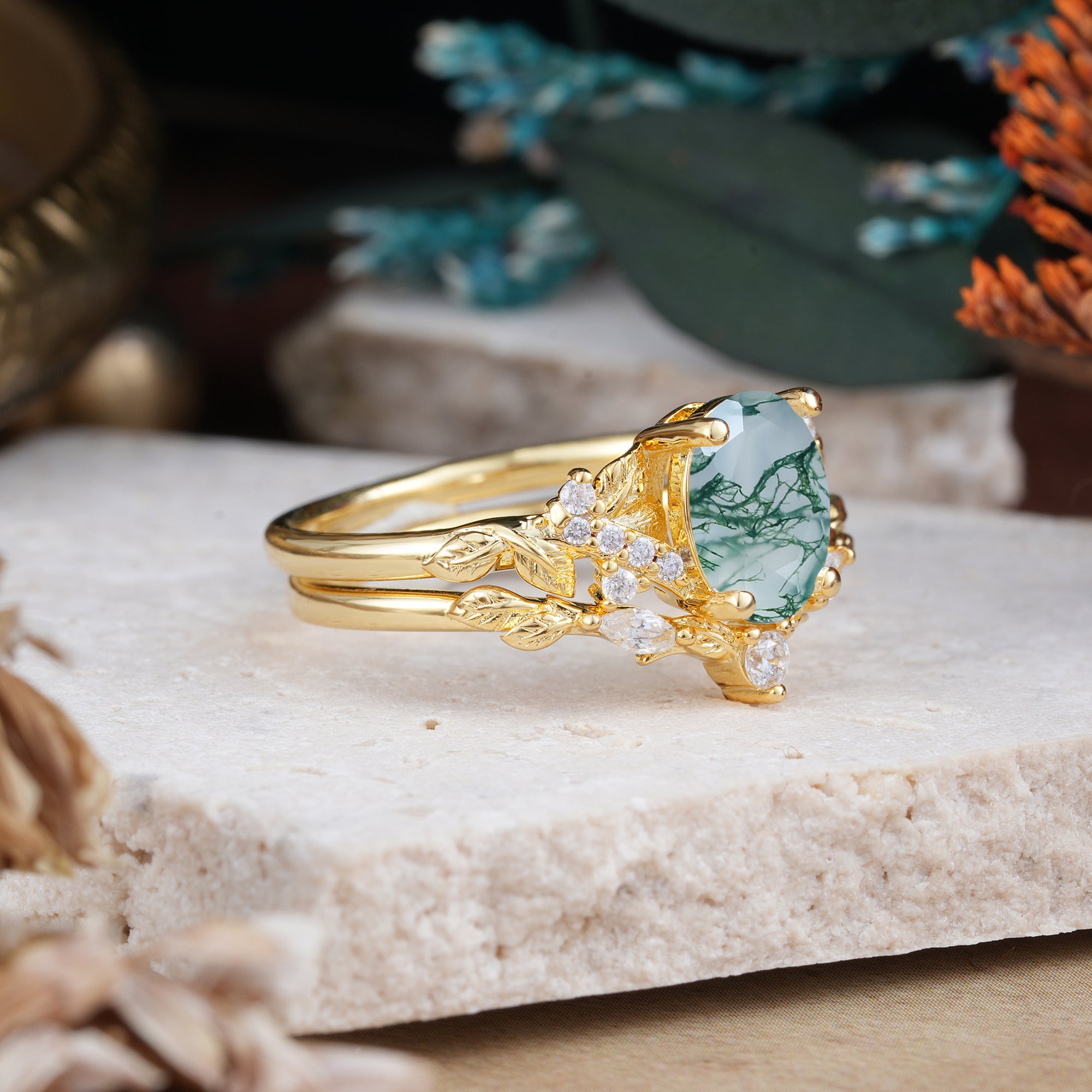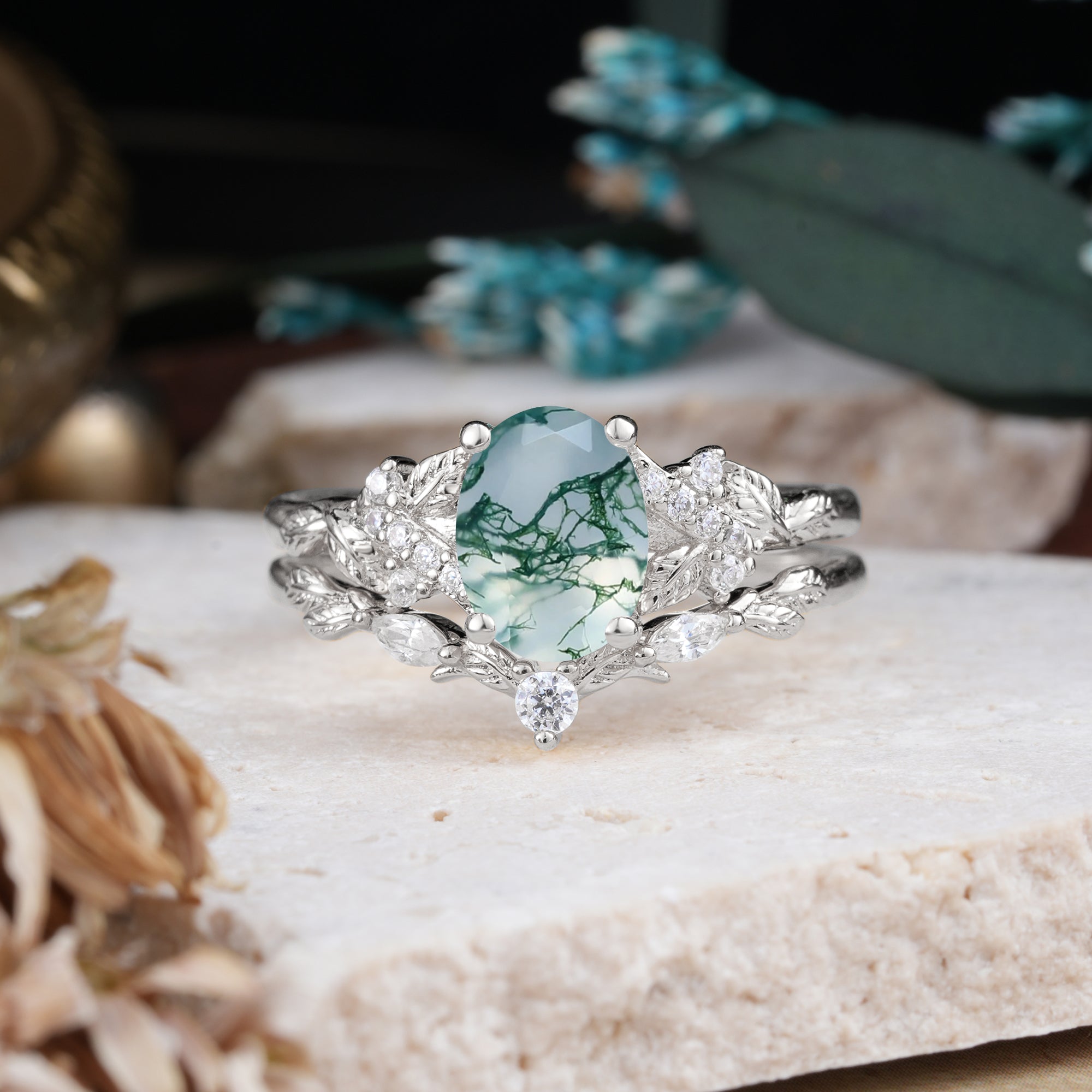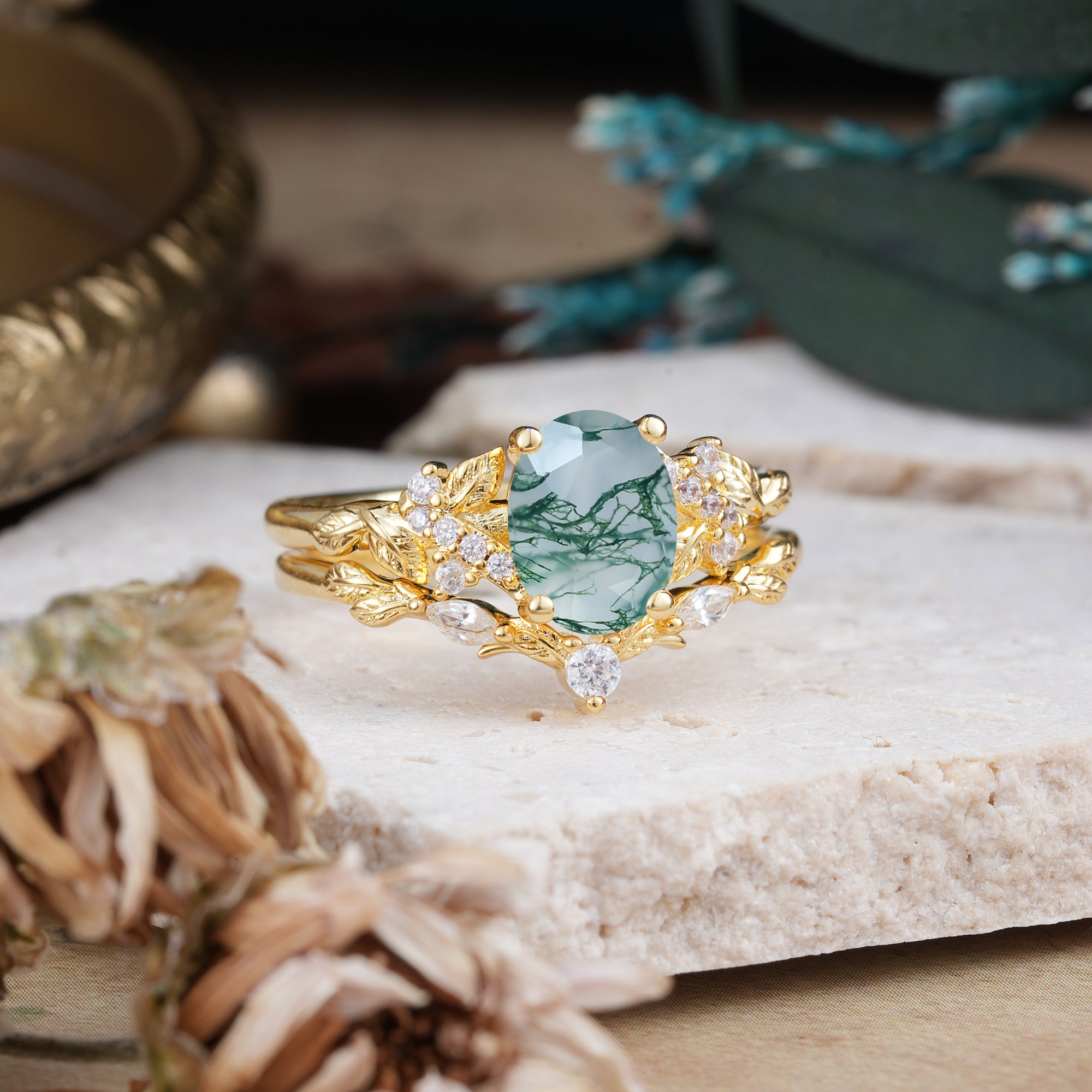 Nature-Inspired Luxury 4-Prong Oval-Cut Natural Moss Agate Engagement Ring Set