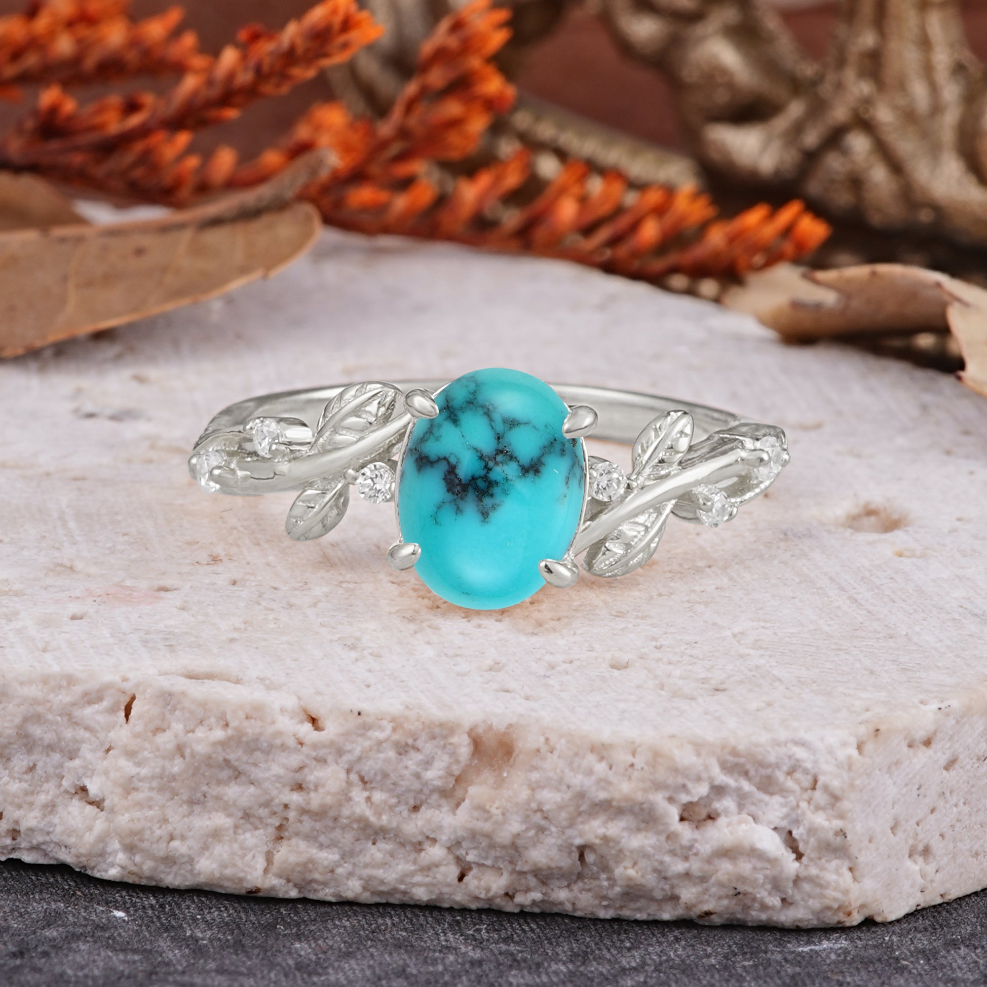 Nature-Inspired Oval Cut Leaf Turquoise Promise Ring for Women