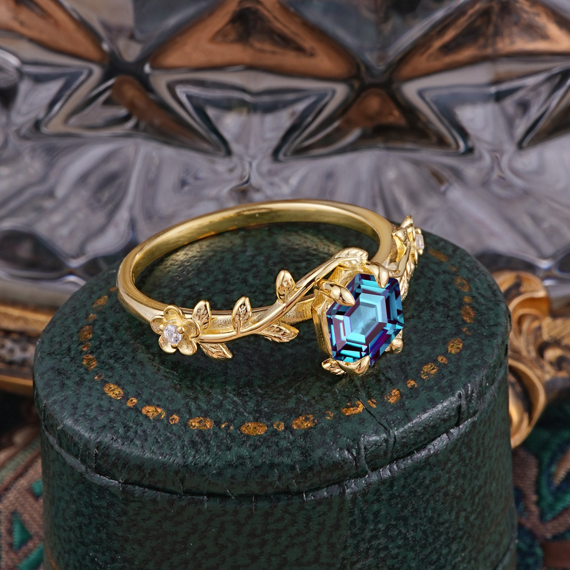 Nature-Inspired Vine-Wrapped 4-Prong Hexagon-Cut Alexandrite Engagement Ring