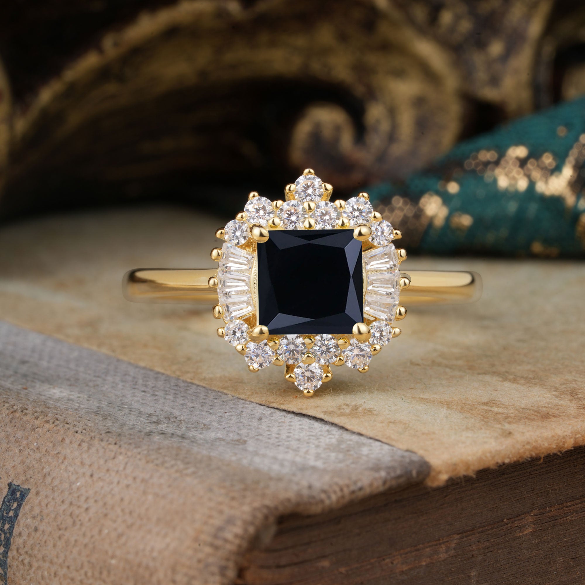 The Princess Cut Black Onyx Engagement Ring Brilliant Cluster Ring is a striking emblem of love and elegance. Its princess-cut black onyx centerpiece, with a deep, glossy sheen, exudes bold sophistication and mystery. Surrounded by a brilliant cluster of sparkling diamonds, the onyx’s allure is amplified with vivid contrast. The band, encrusted with pavé diamonds, radiates luxurious shine. This princess-cut black onyx engagement ring merges modern geometric precision with timeless glamour, offering a unique, unforgettable choice for a lasting commitment.