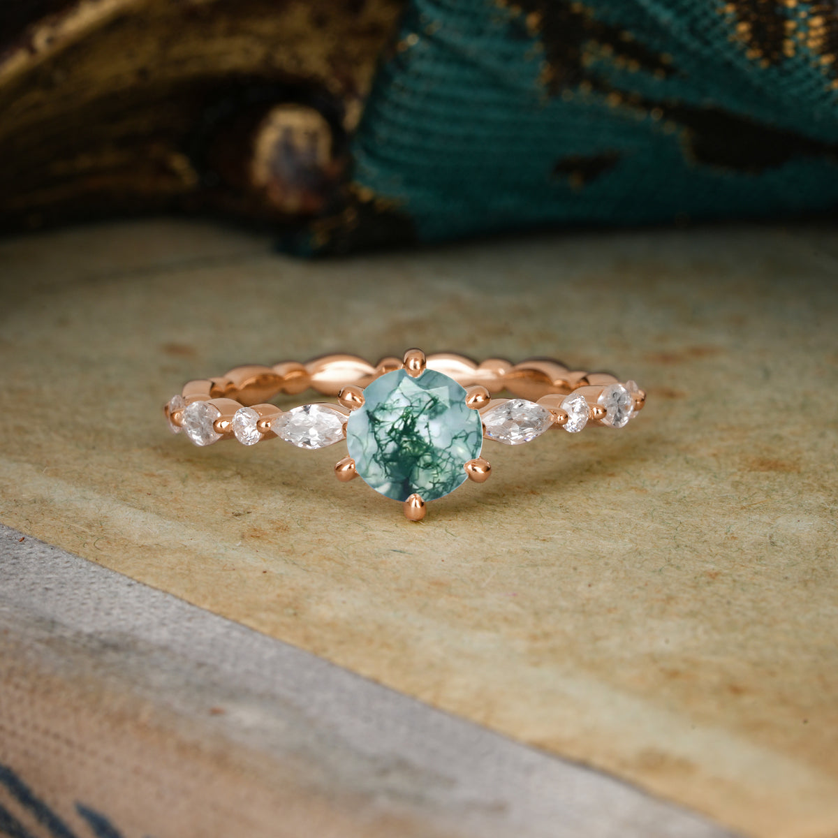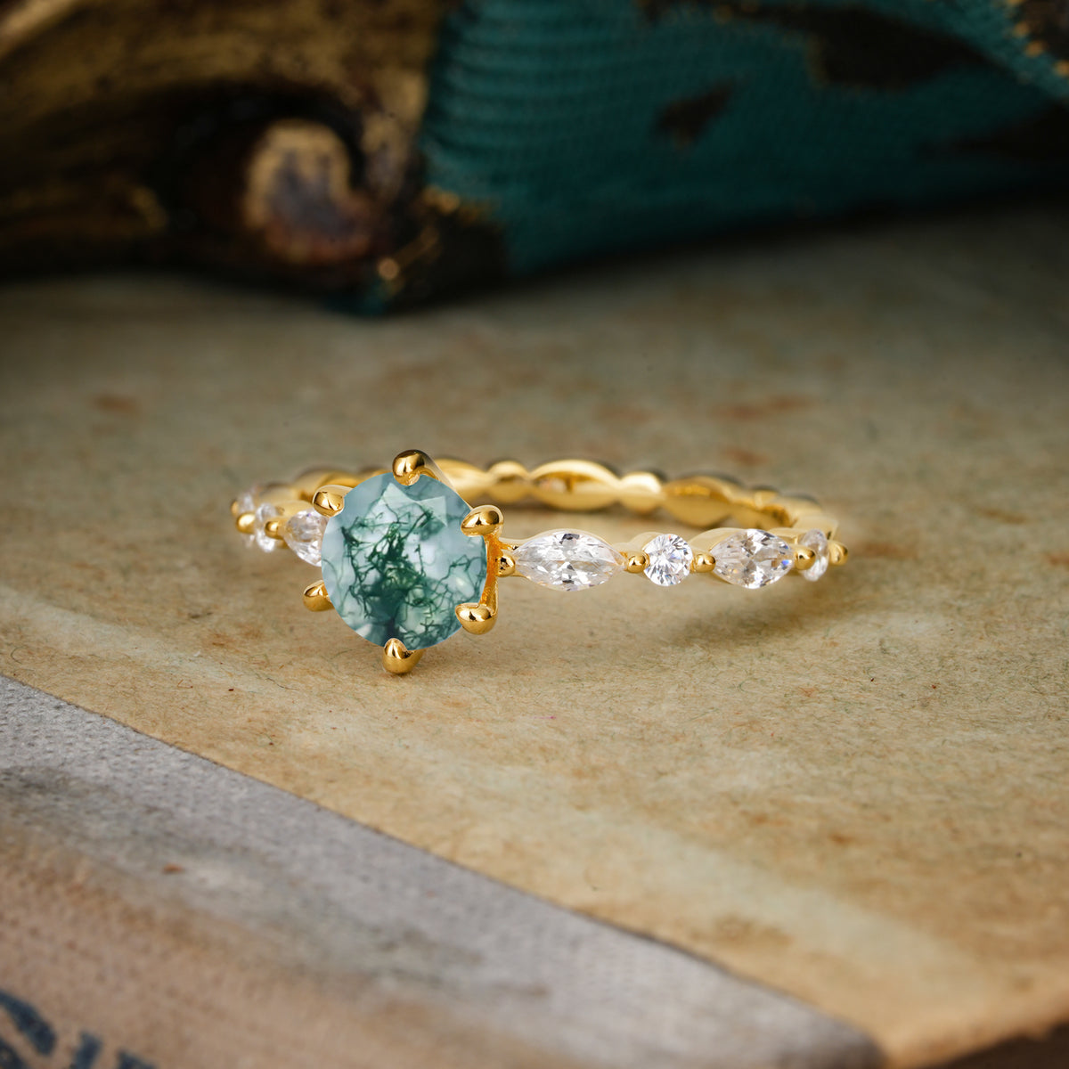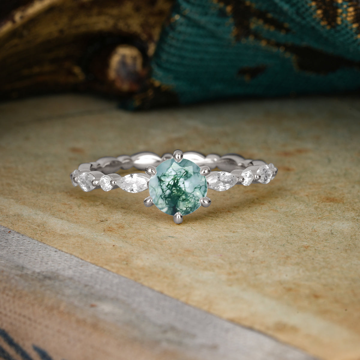 Round Cut Classic Side Stone Moss Agate Promise Engagement Ring