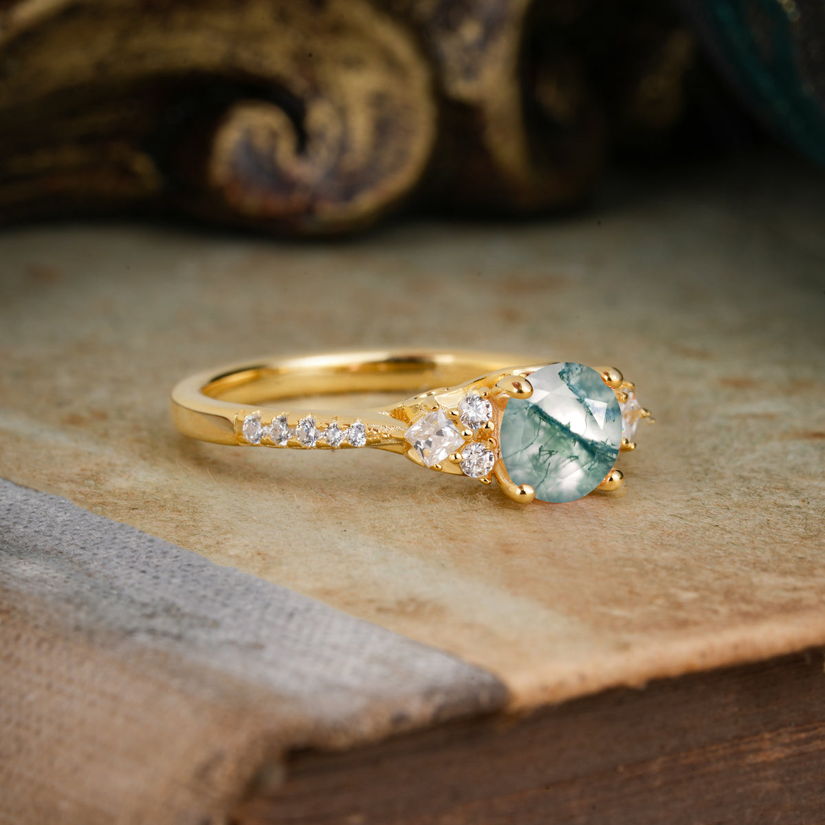 Round Cut Moss Agate Classic Side Stone Engagement Ring