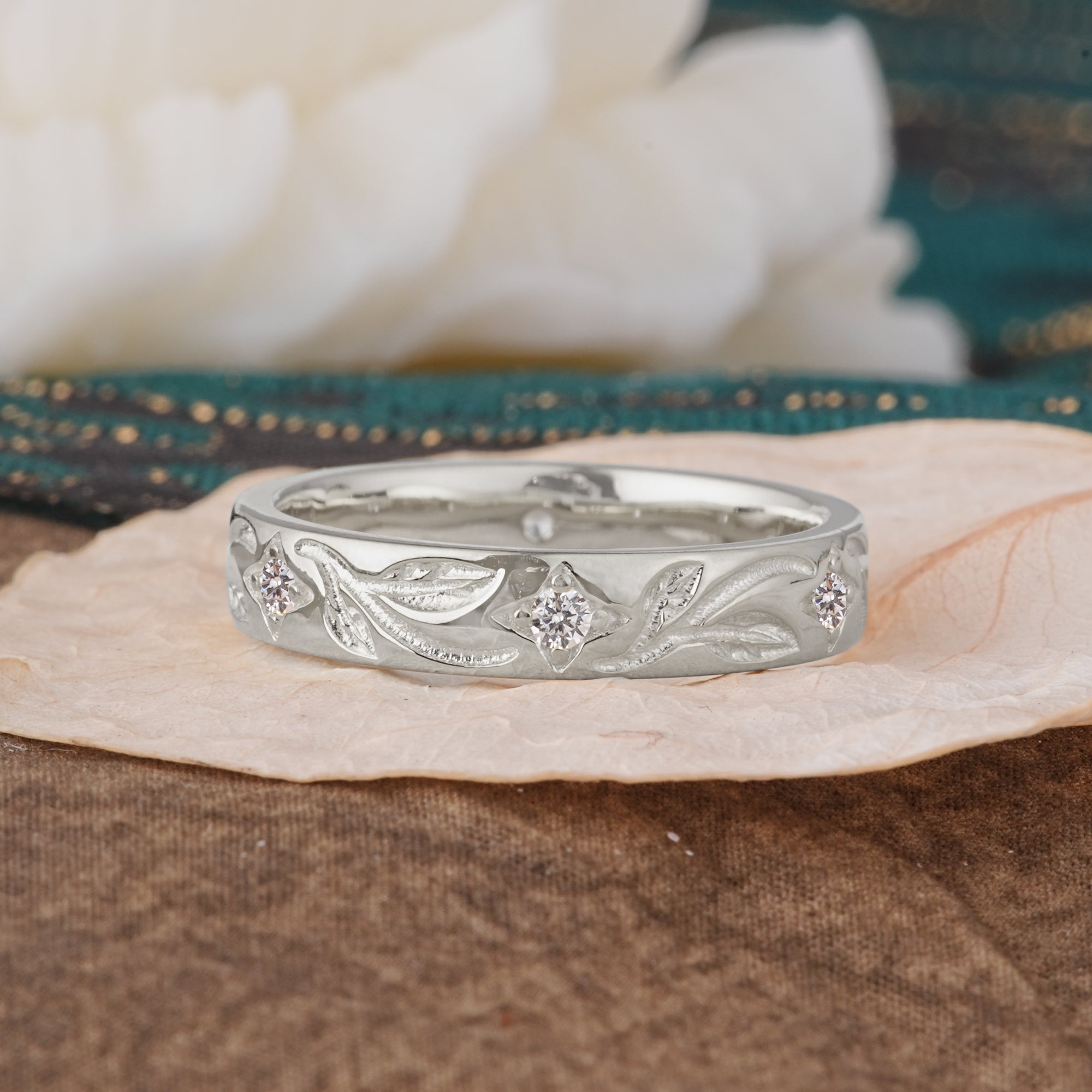 Round Cut Vine Engraved Design Men's Moissanite Promise Ring
