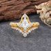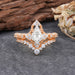 A unique 2-piece engagement ring set featuring a stunning kite-cut moissanite center stone surrounded by a sparkling cluster of accent stones. Handcrafted with intricate detail, this modern yet vintage-inspired design offers brilliant sparkle and bold geometry. Perfect for the bride who loves a distinctive, artistic touch.
