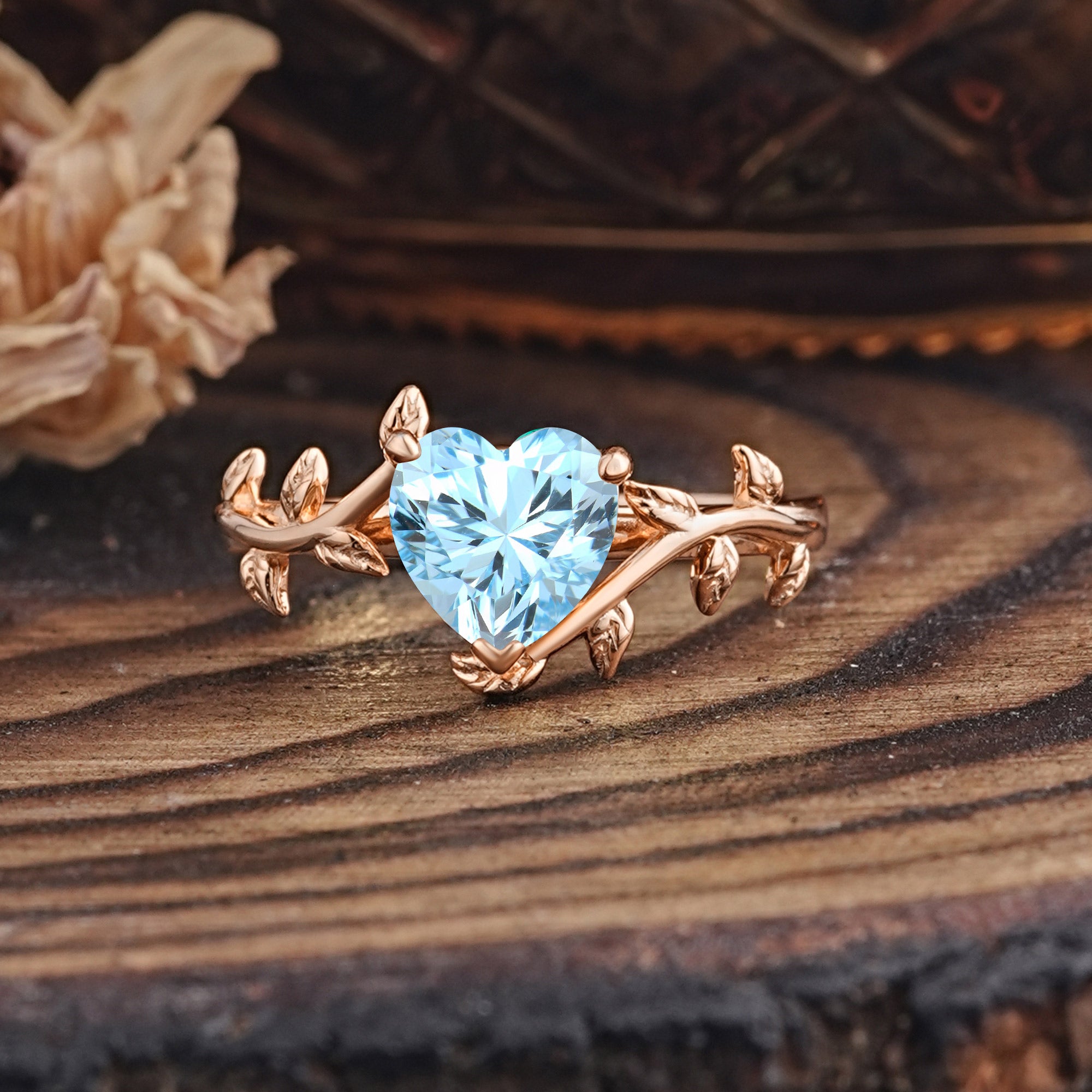 Unique Design Heart Cut 3 Prong Aquamarine Leaf Engagement Ring