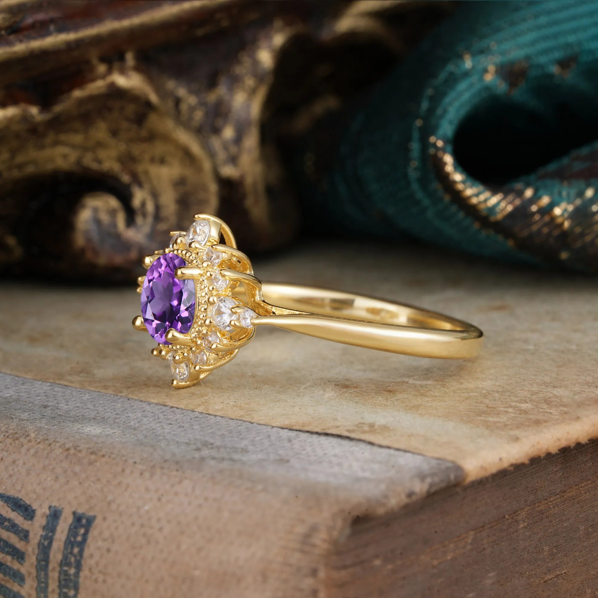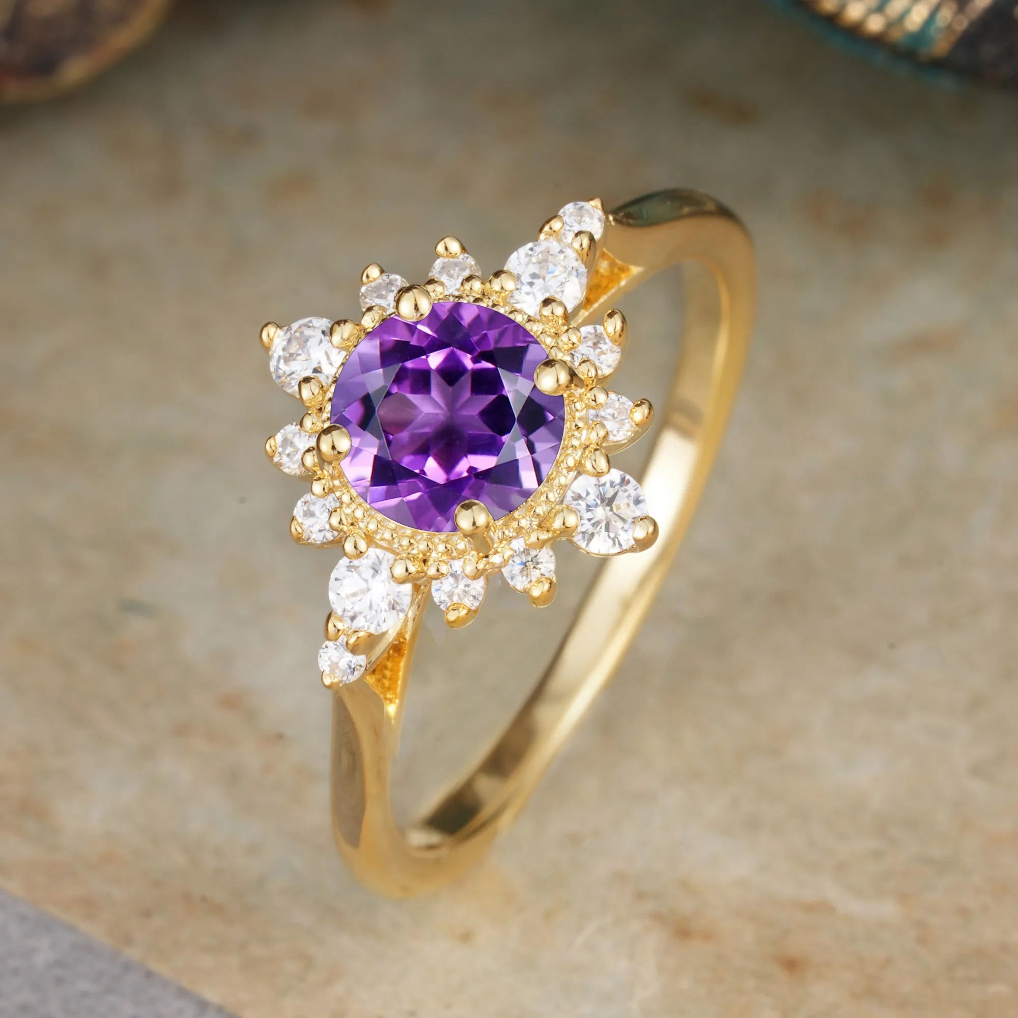 Vintage Round Cut Cluster Amethyst Wedding Ring Flower Engagement Ring