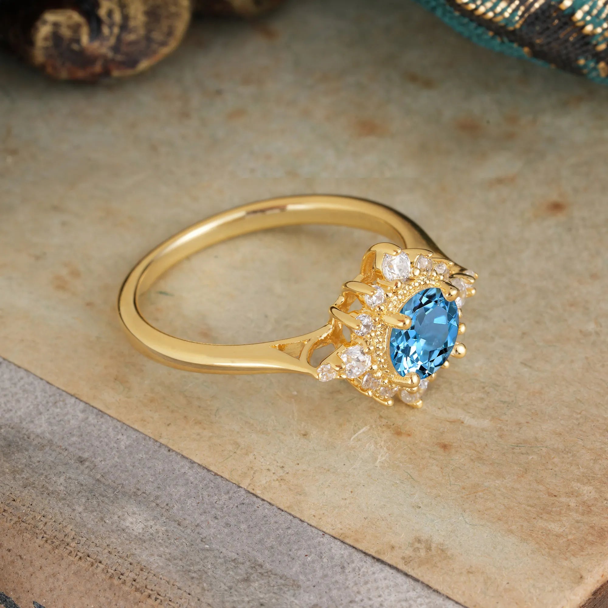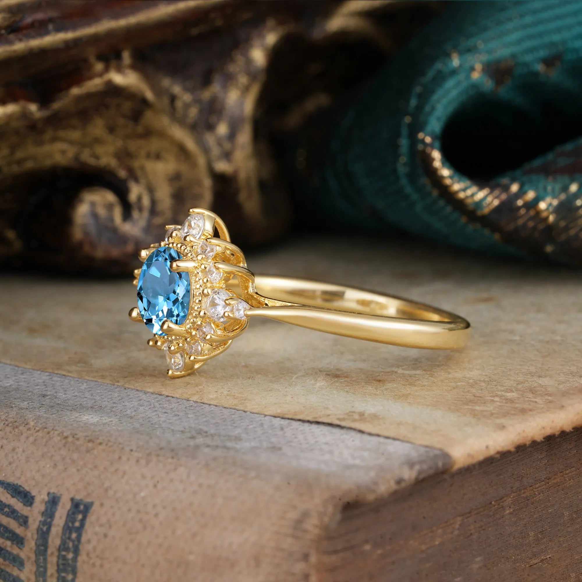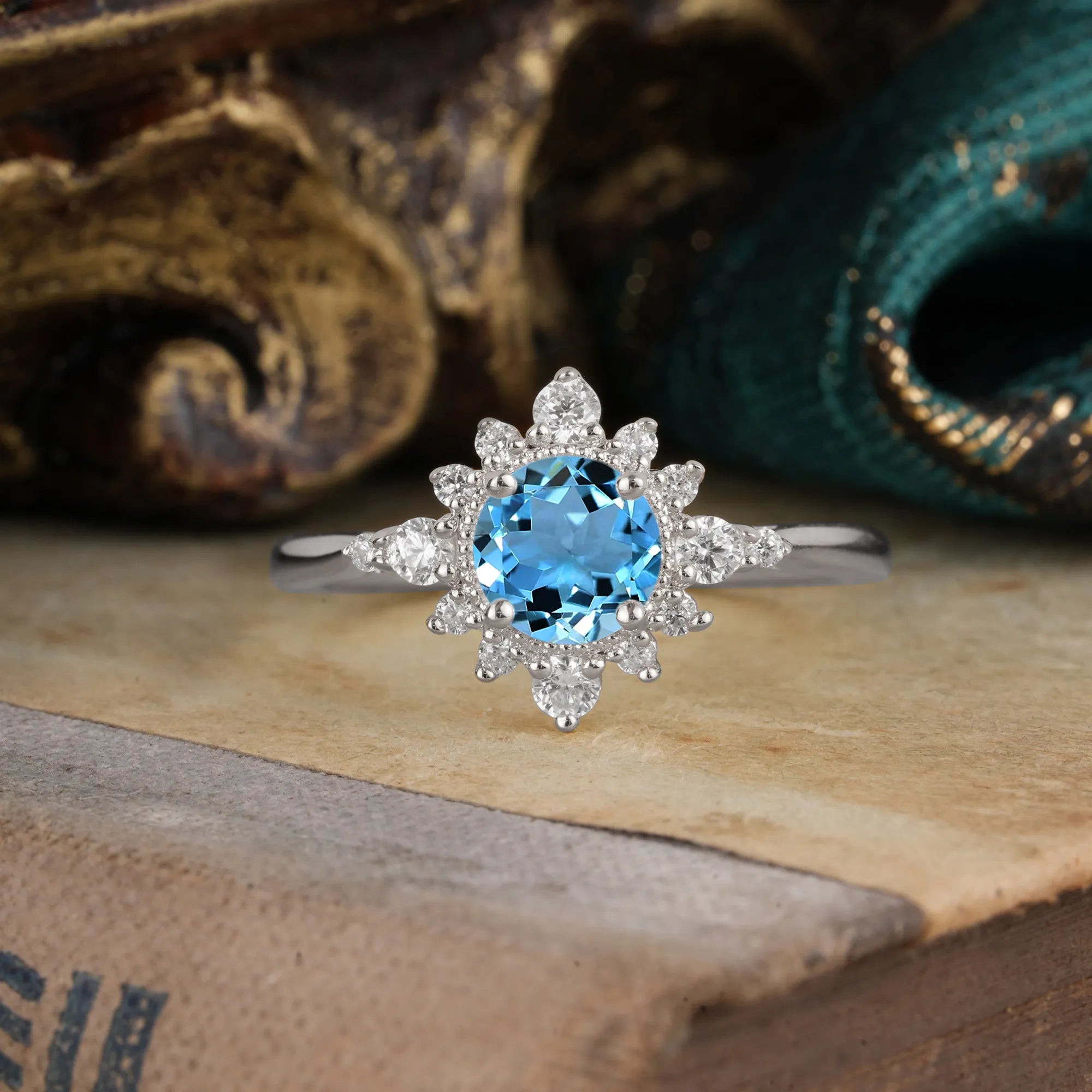 Vintage Round Cut Cluster Aquamarine Wedding Ring Flower Engagement Ring